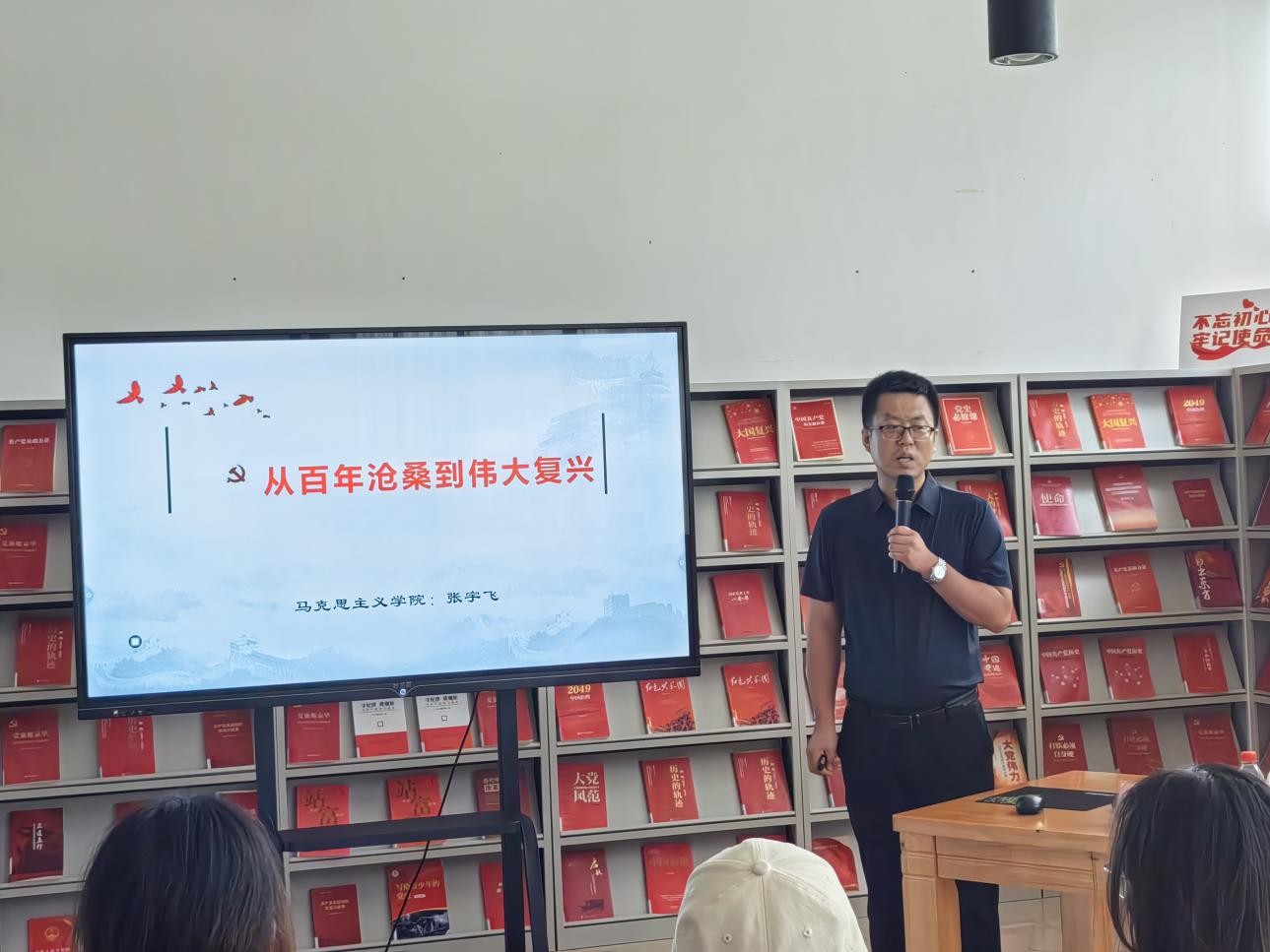 10月22日下午4:00,张宇飞老师在图书馆三楼“红色阅读角” 举办红色知识专题讲座,本期讲座的主题是从百年沧桑到伟大复兴。我校建筑与环境艺术设计学院积极分子到场聆听讲座并参与互动,氛围良好,同学们纷纷表示受益匪浅。(张家梅摄)