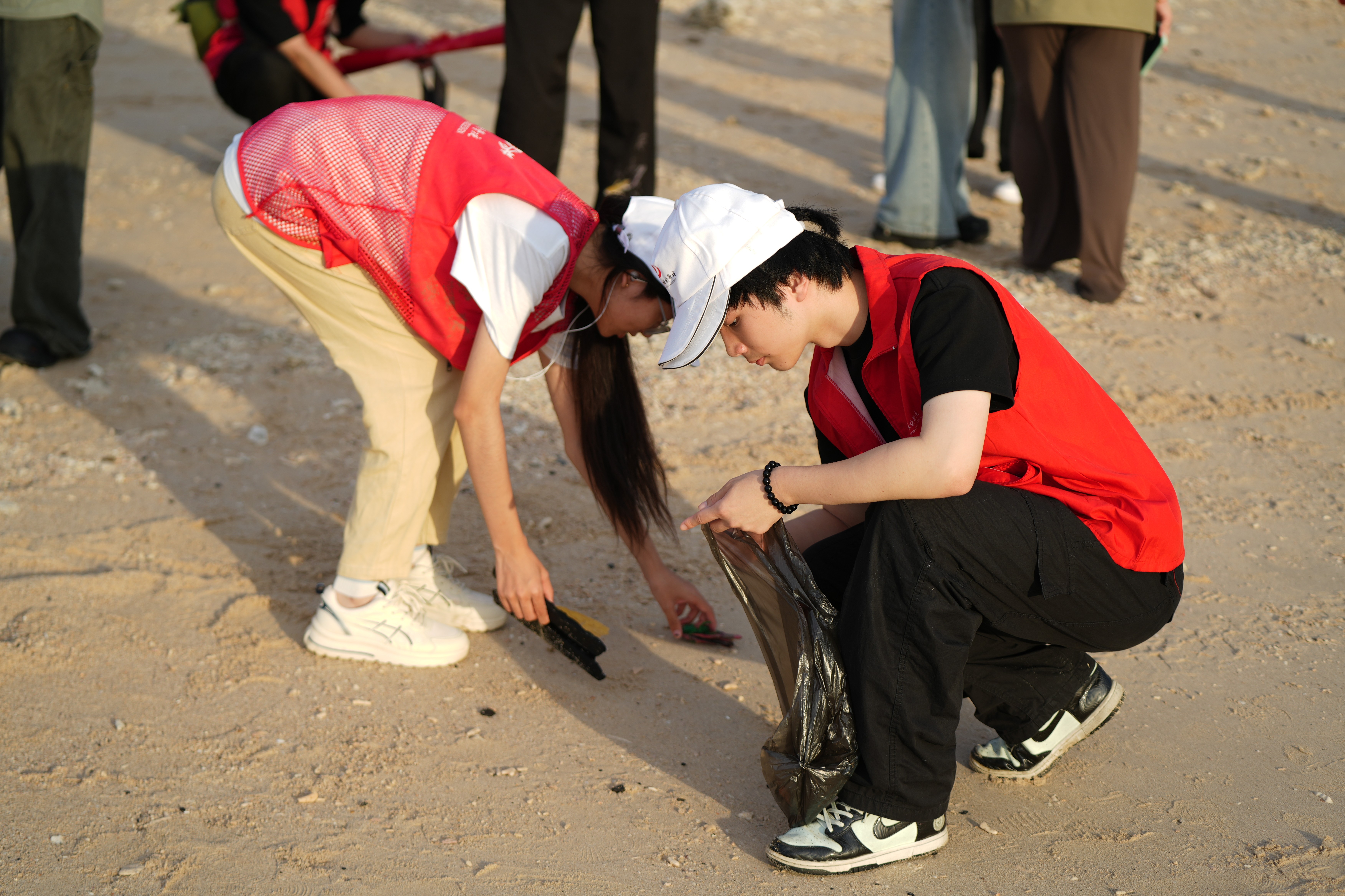 活动伊始,志愿者们纷纷穿上红色马甲,按照分团委指导老师安排的区域分为三个小组展开行动。他们沿涠洲岛蜿蜒的海岸线散开,俯身拾起被潮水推上岸的塑料瓶、渔网碎片和零食包装——那些藏匿在碎珊瑚与礁石缝隙间、附着在沙滩贝壳旁的垃圾,都被他们仔细地找出来,一一收集进分类垃圾袋中。此刻夕阳照在每一位志愿者的身影上,映照出影视动画学院分团委团结奋进的集体意识与不负使命的责任担当。
