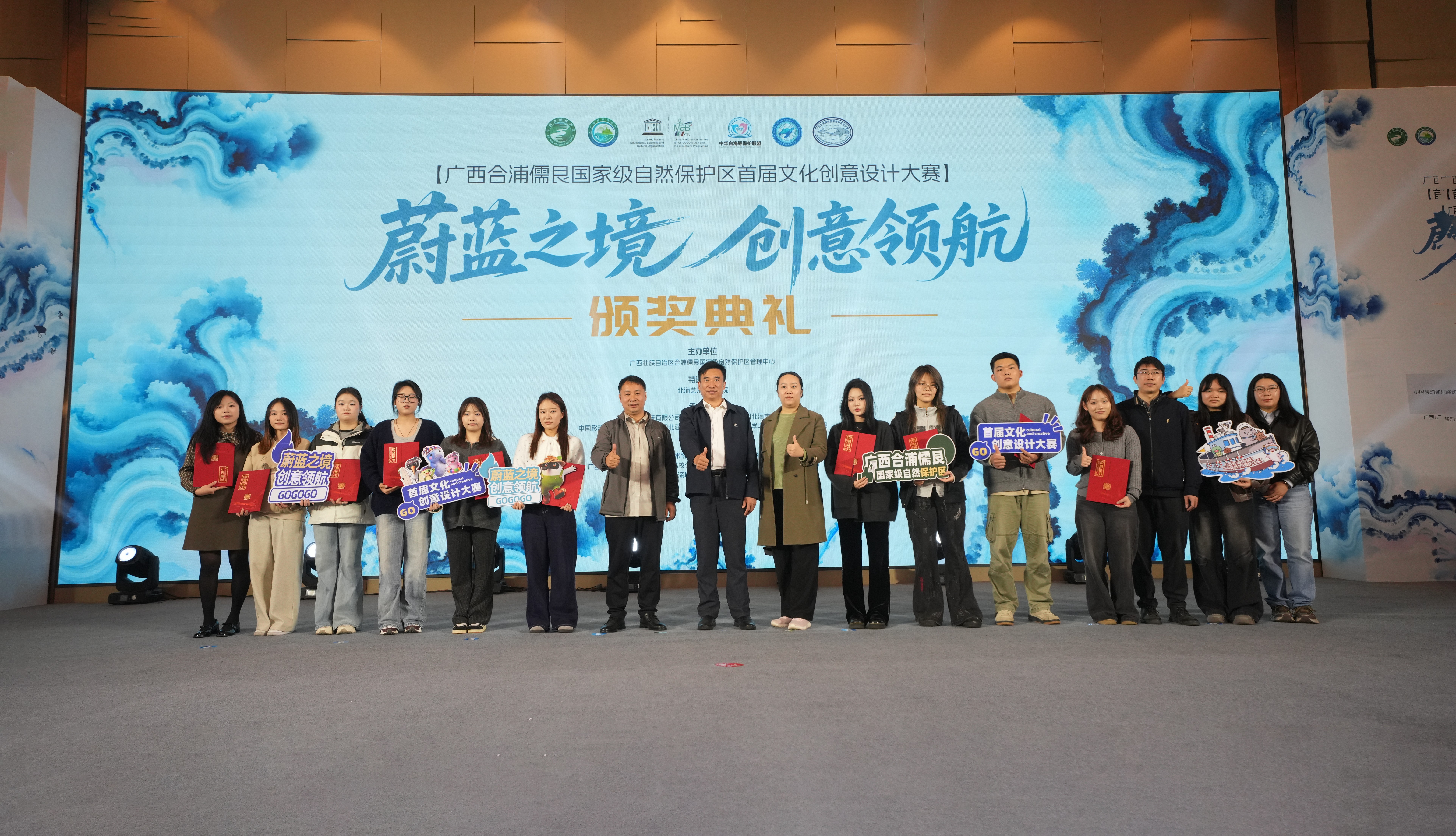 2026年1月15日,【蔚蓝之境·创意领航】广西合浦儒艮国家级自然保护区首届文化创意设计大赛颁奖典礼圆满落幕。我校造型艺术学院师生凭借扎实的专业功底与创新的设计理念脱颖而出,揽获特等奖1项、一等奖1项、二等奖1项、三等奖6项及入围奖8项,用设计创意助力广西合浦儒艮保护区生态保护创新发展!