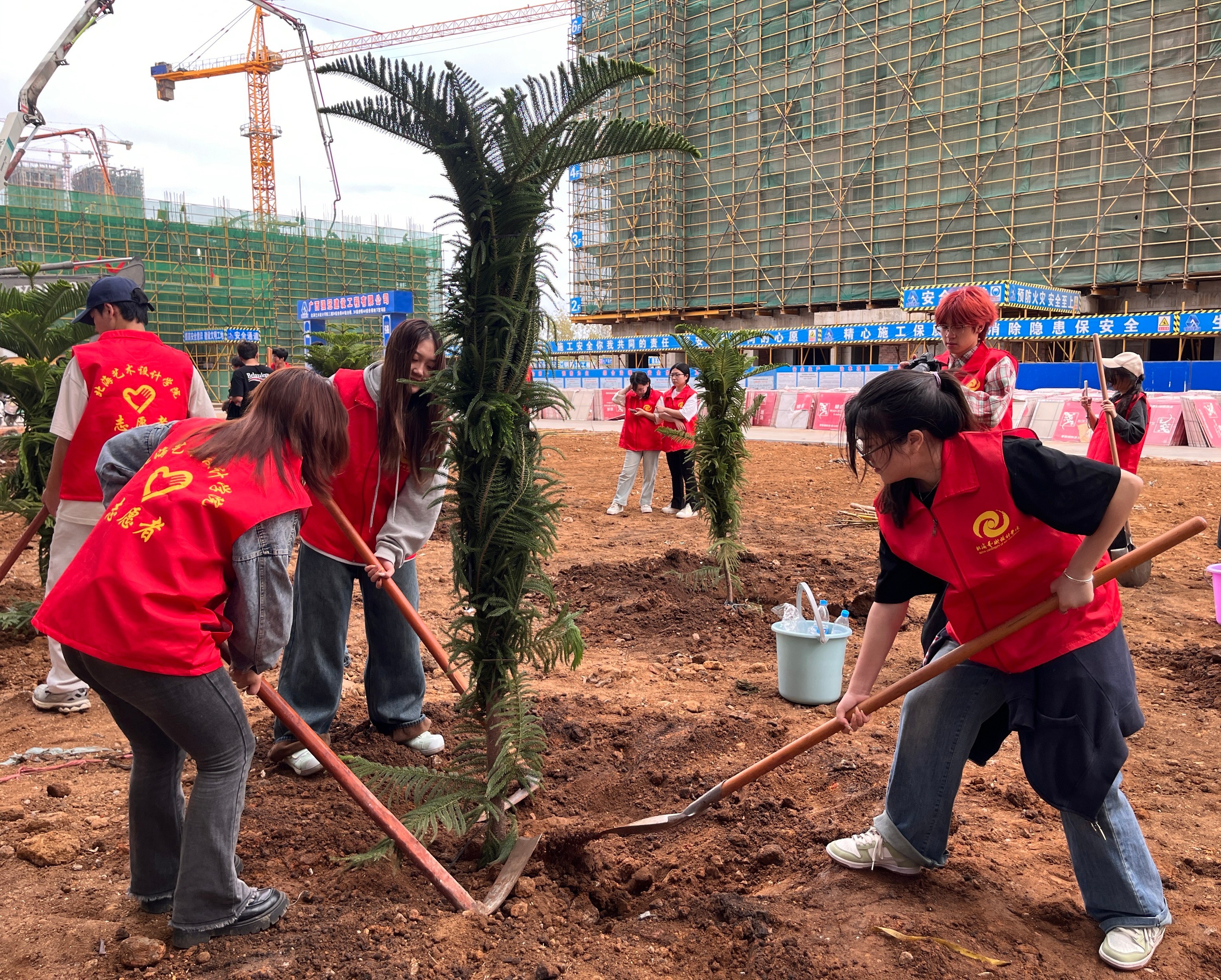志愿者们怀揣着热情与期待,手持工具迅速投入热火朝天的植树活动中。挥锹挖坑,放苗入坑,小心扶正,填土夯实,提桶浇水,他们分工协作,默契配合,井然有序,合力完成每一道植树工序。