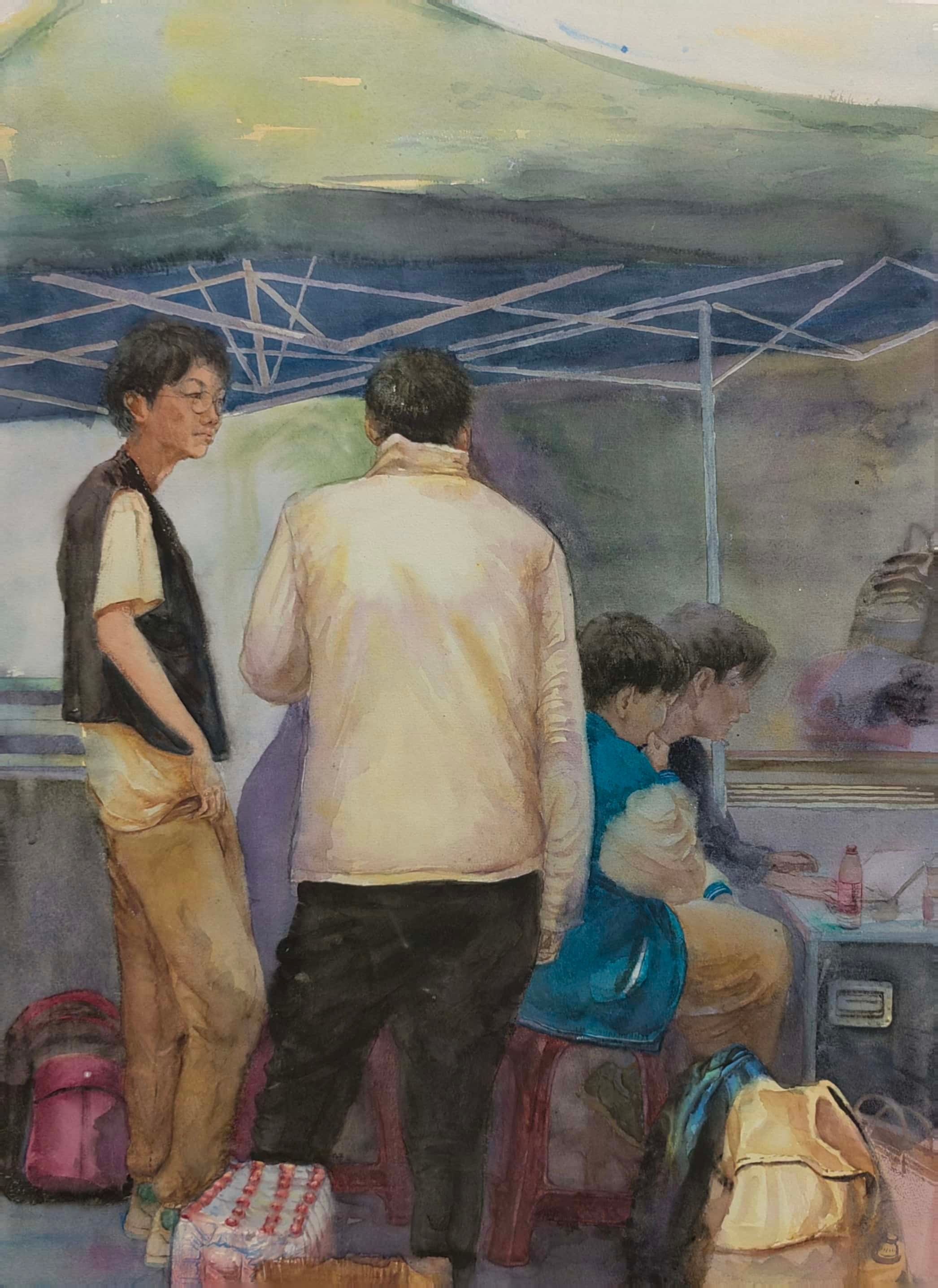 杨嘉丽《工地的午餐》52cm×74cm   2023年 纸本水彩