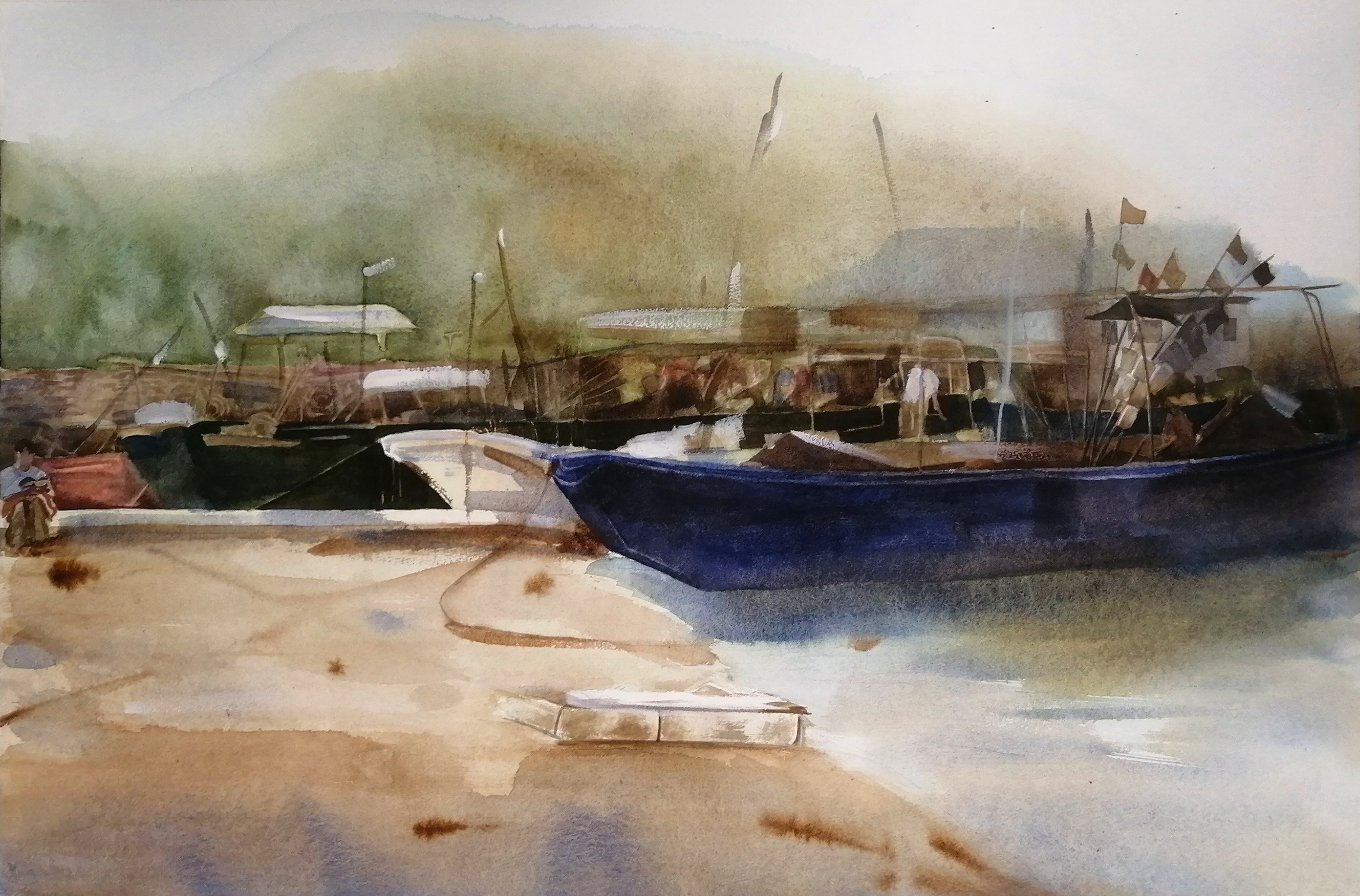 梁晓明《休渔时节》  50cm×55 cm  2023年 纸本水彩