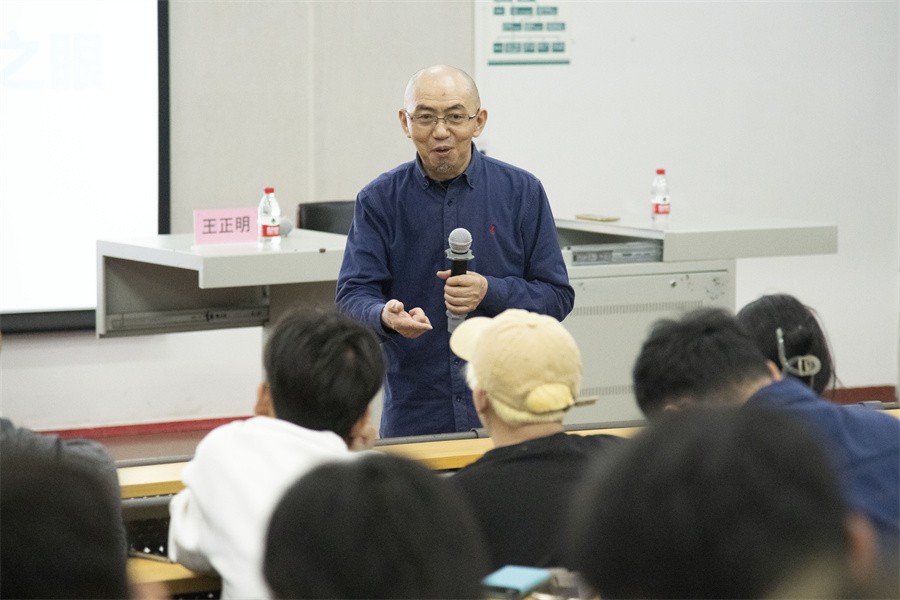 讲座伊始,王正明教授详细介绍并解读了讲座主题的深刻含义。他结合自身的经历和工作经验,同在场师生分享了自己对设计的感悟,并通过多个角度分析“设计的根本、设计背后的因素是思想”这一概念。