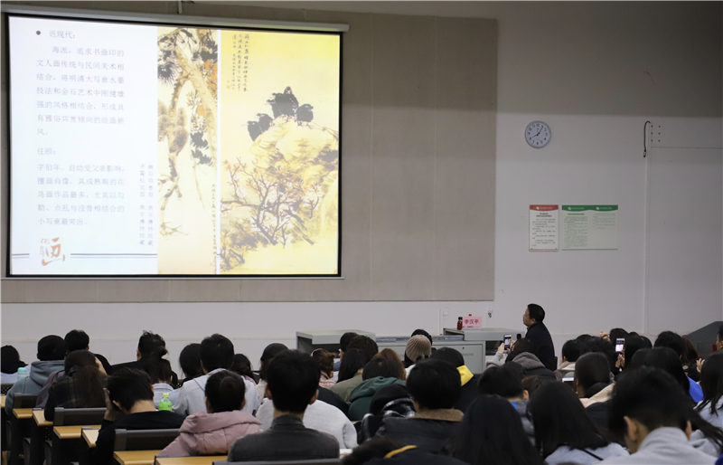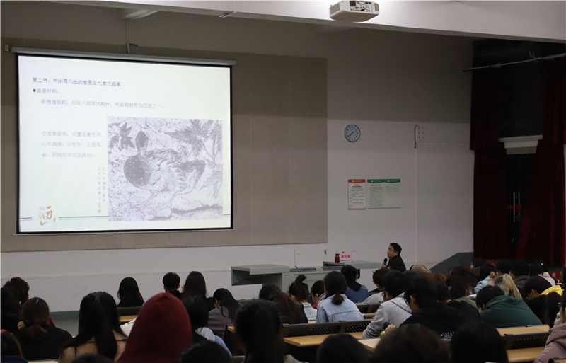 李汉平教授介绍了中国花鸟画界的一些著名大家,其中在元代背景的影响下花鸟画向文人情趣发展,从入元不士终生隐居的钱选到赵孟頫夫妻,从擅墨梅的王冕到师从文同的柯九思,到了明朝的花鸟画成就最为突出,涌现了一批优秀的花鸟画大家。近代的海派和岭南画派代表人物齐白石、张大千及潘天寿等名家。详细的介绍让同学们深刻的了解到不同时期中国花鸟画的特点。