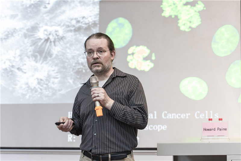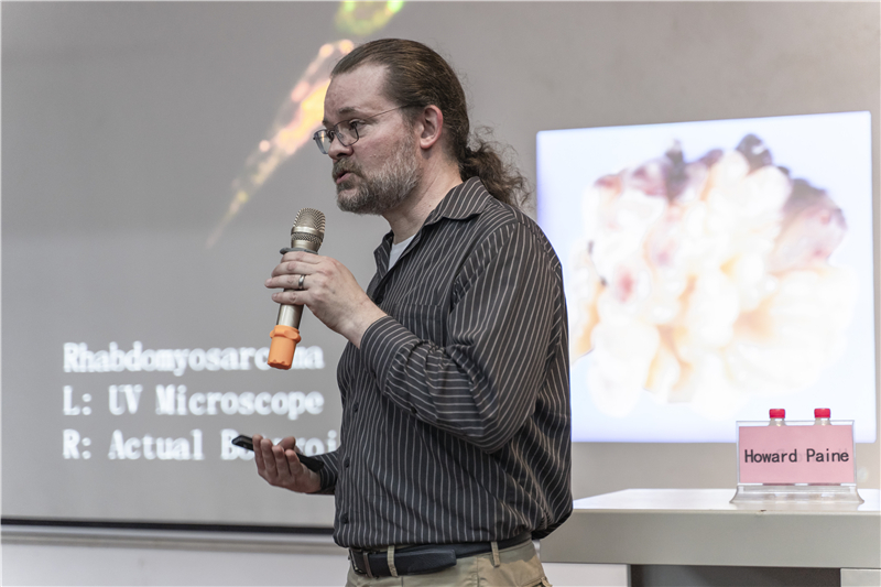 首先,霍华德.佩恩教授展示了木板画——印刷成品呈现出自然的效果,这些纯手工木版画作品的灵感来源于自然的花木与昆虫样板,手工木版画的魅力给大家留下了深刻印象。随后,霍华德.佩恩教授通过自身经历与经验给大家讲述了科学与艺术之间的故事,让大家更清楚的了解到科学研究中所蕴含的艺术价值,优秀的艺术作品需要进行再创新、再创作。接着,霍华德.佩恩教授通过一组动物生死轮回的图片阐述了死亡背后蕴藏着故事,从而突出了死亡中的美与魅,一些创作灵感往往来源于这些生命中。