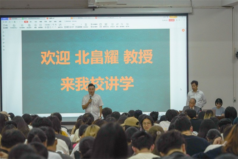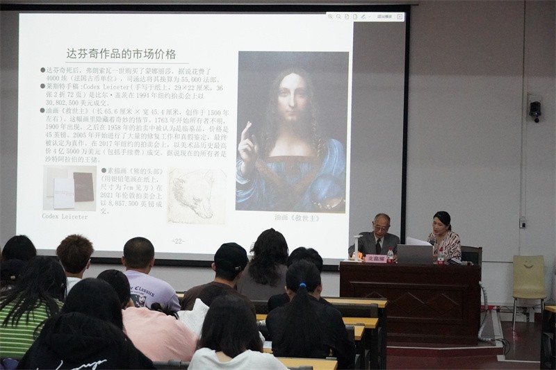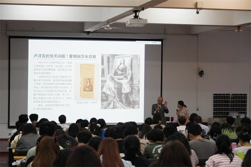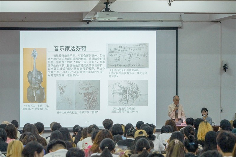 讲座伊始,北畠耀教授以幽默风趣的语言对达芬奇个人以及蒙娜丽莎作品展开了专门介绍。他以具象四个部分展示达芬奇辉煌成就的一生经历。北畠耀教授表示世人对达芬奇的历史评价极高,达芬奇的才能在丰富多彩的领域中得到了极大发挥,北畠耀教授还列举总结了达芬奇在八个领域下的才能并通过讲述达芬奇绘画蒙娜丽莎作品的趣事经历,引导广大师生勤于思考,强化观察能力,追求完美,从而提高自身创作的水平。