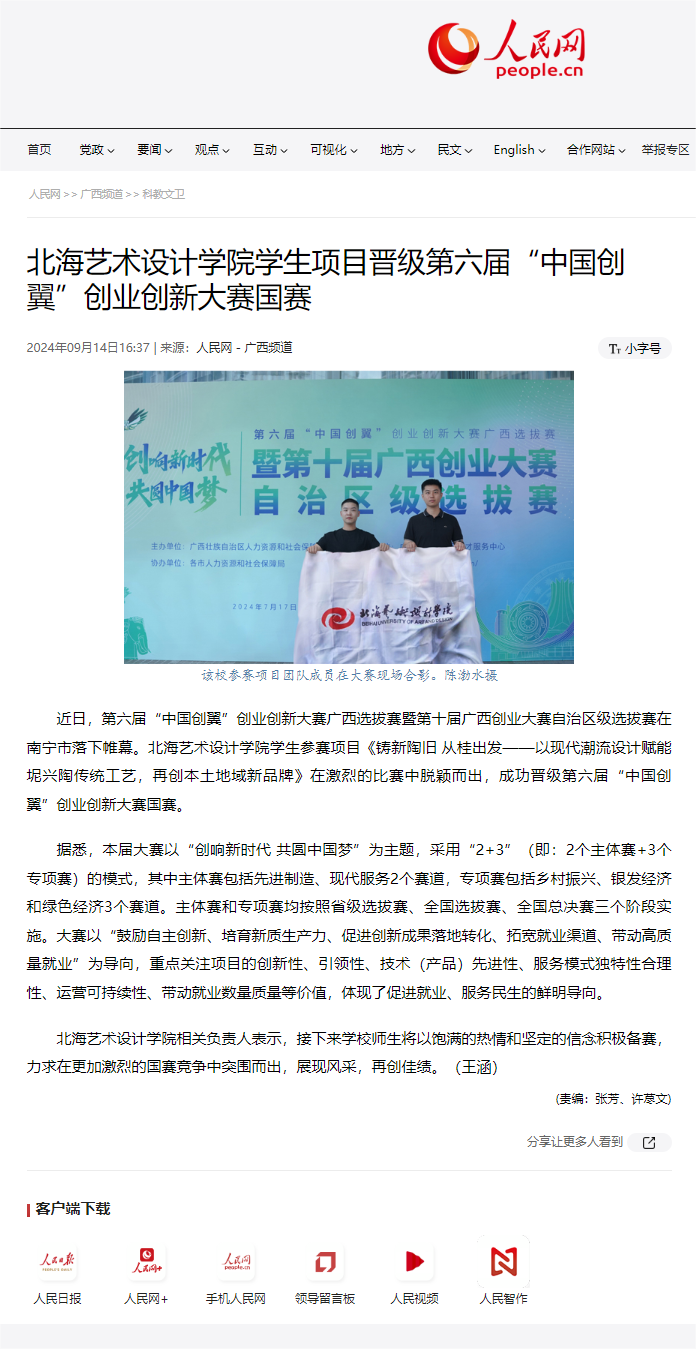 人民网:北海艺术设计学院学生项目晋级第六届“中国创翼”创业创新大赛国赛