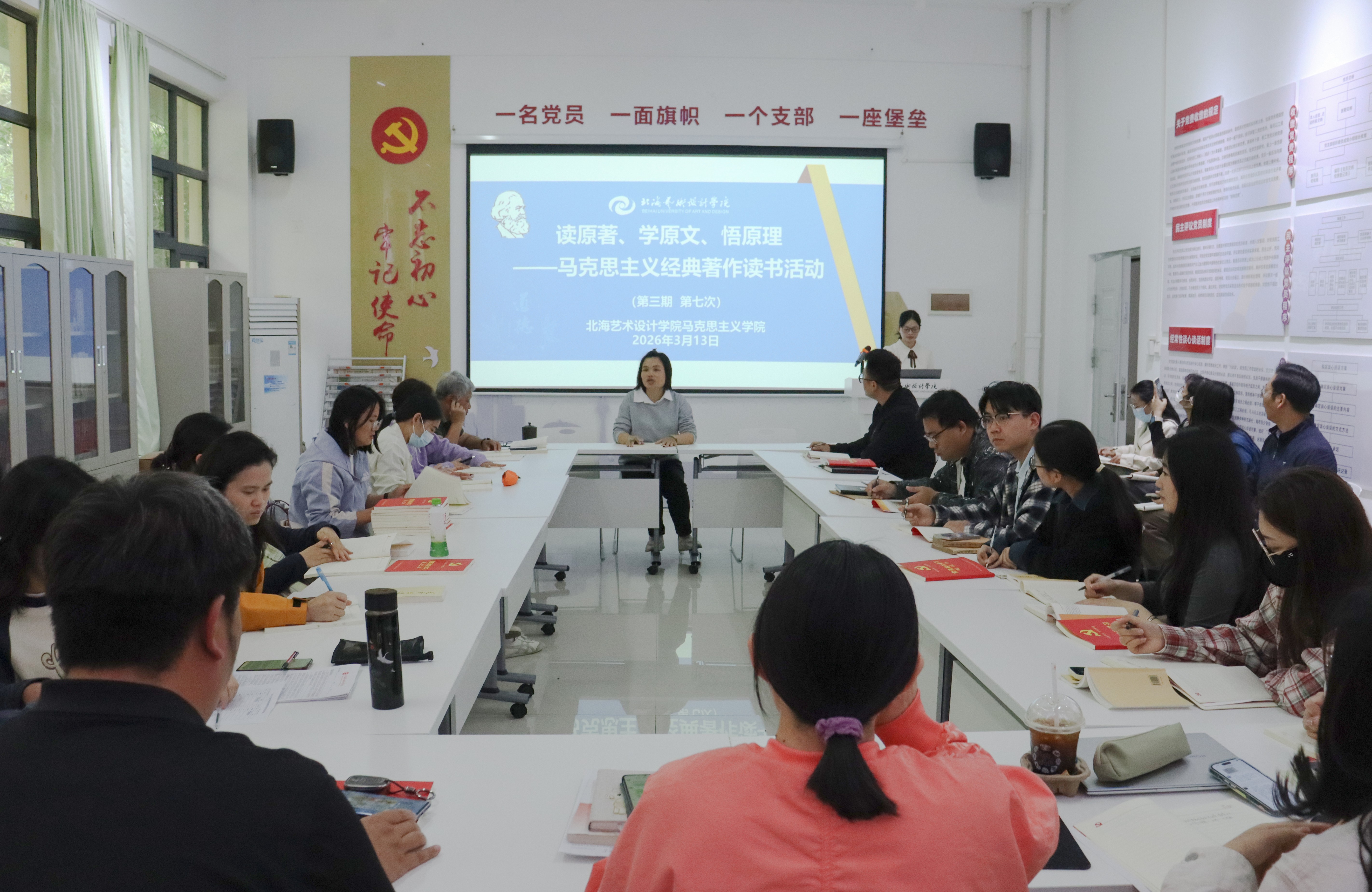 3月13日,马克思主义学院在西校区行政楼103红色驿站举行第三期马克思主义经典著作读书第七次活动。活动由马克思主义学院副院长罗秋梅主持,马克思主义学院中国近现代史纲要及中华民族共同体概论教研室主任刘贻敏主讲《星星之火,可以燎原》,马克思主义学院全体中青年教师参加。