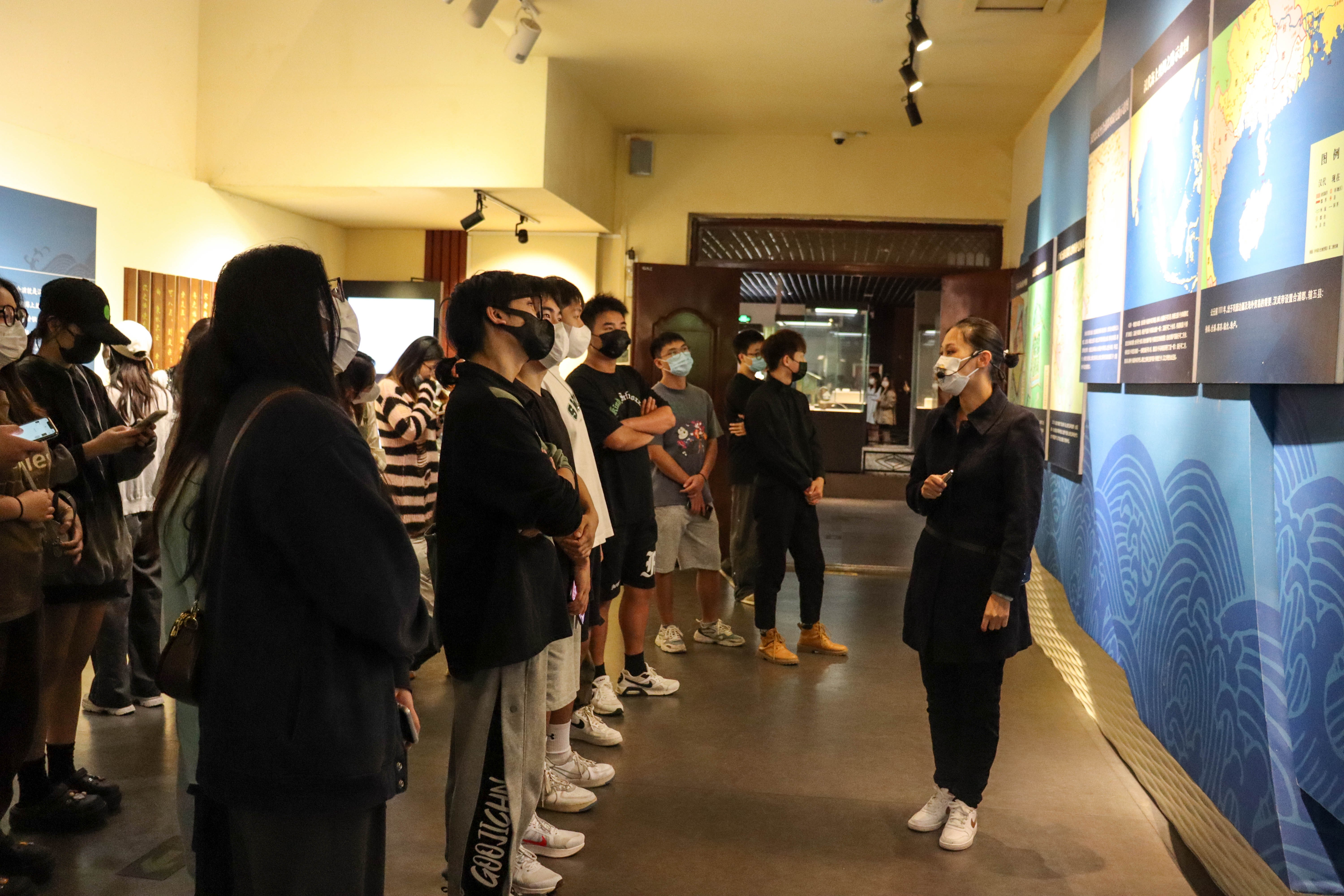 活动由马克思主义学院院长姜献生带队,习近平新时代中国特色社会主义思想概论教研室主任胡细木副教授总协调,5位带班老师全程管理,有共207名学生现场听课。师生队伍先后到达了合浦汉代文化博物馆、月饼小镇进行现场教学和参观学习。首先,胡细木副教授在合浦汉代文化博物馆前给学生上了一堂耳目一新的思政课。接着,跟随着博物馆解说员参观了青铜之光、土火之韵、碧海丝路等展厅,重走了习近平总书记的参观路线;学生们从青铜器、陶器、金银器、水晶玛瑙、琥珀松石等等一件件珍贵文物,深刻认识了合浦作为海上丝绸之路重要始发港的历史文化。最后,来到了月饼小镇月饼文化展示馆,大家通过月饼模具、展板解说、人物塑像、现场体验等,切实感受了合浦源远流长的千年月饼文化。