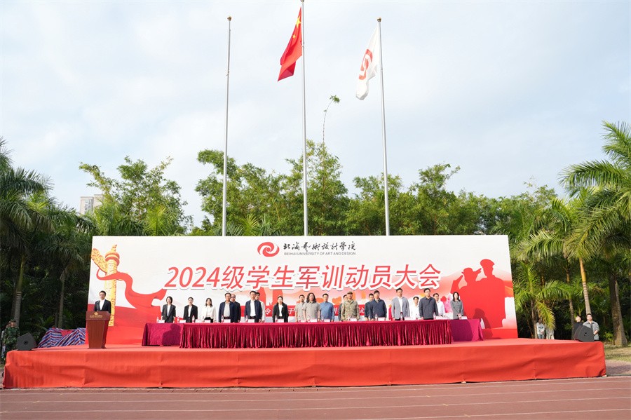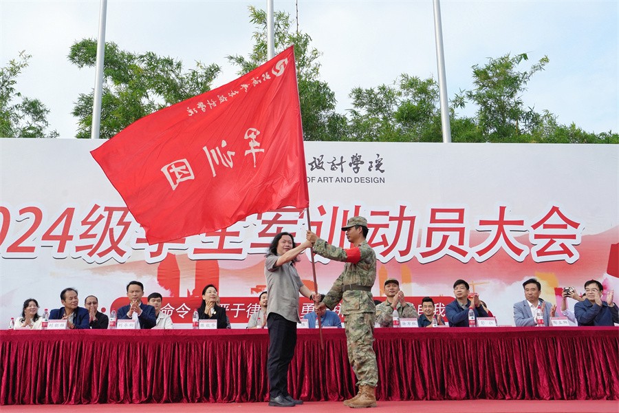 动员大会上,我校常务副校长胡胜向北海市海城区人民武装部领导授军训团团旗并宣布2024级学生军训开训。(周小琪、李伟民、王金凤、李炯菲、郭松/摄)