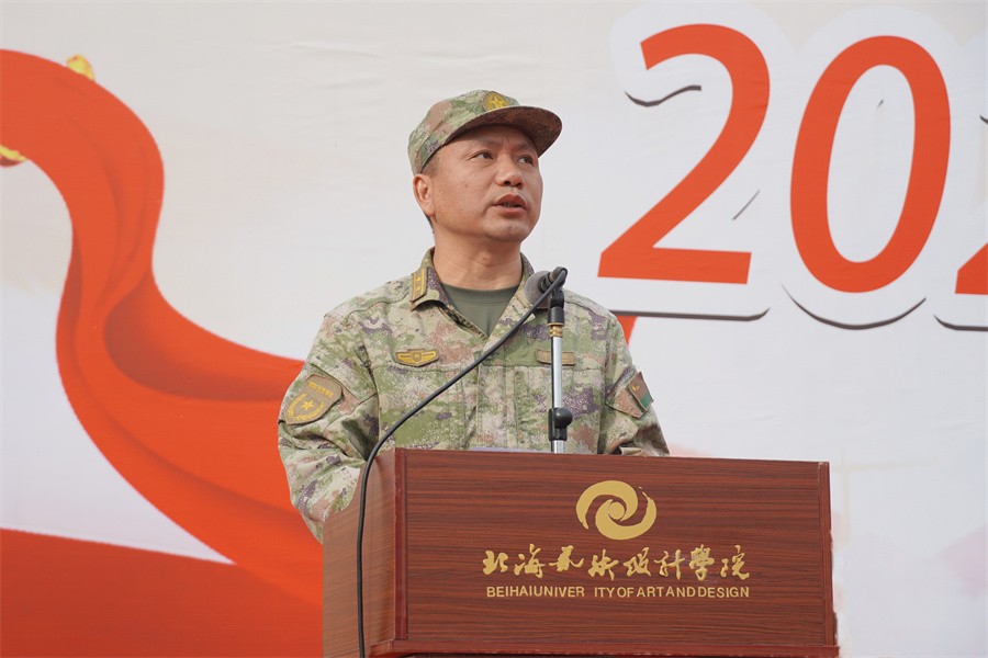 北海市海城区人民武装部副部长涂军红在讲话中阐述了军训的重要性。他指出,学生军训是学校强化思想政治建设,落实立德树人的根本任务、提高教学质量的重要手段,同时也是磨砺学生意志、增强身体素质、养成良好习惯的有效途径,对加快推进人才强国建设,实现中华民族伟大复兴意义非凡。他对全体参训学生提出希望:一是要胸怀远大抱负,激发爱国拥军的高尚情怀。爱国主义是中华民族文化的核心,是民族精神的主题。大家要在军训中增强国防意识,树牢国防观念,培育家国情怀,努力做一个负责任、有担当、能作为的优秀青年。二是要发扬从军尚武精神,锤炼敢打敢拼的意志品质。同学们要在军训中磨砺顽强作风和无畏精神,激发奋勇争先的拼搏意志,坚定不畏困难、战胜自我的决心和勇气。提高适应能力和抗压能力,为今后的学习、工作、生活打下坚实基础。三是要遵循军队的标准,培养遵规守纪的行为自觉。军队是一个雷厉风行、令行禁止的集体。大家要服从命令、听从指挥,持续强化纪律观念。严格要求自己,自觉敬畏纪律,争做德智体美劳全面发展的好学生。同时,他向军训教官提出了“要发挥模范作用”“要遵循训练规律”“要遵守军训纪律”三点要求,发扬部队不怕苦、不怕累精神,扎实展开训练,让学生在训练中真正学有所获,不辜负重托,圆满完成军训任务。