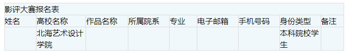 (二)参赛者发送报名材料要求如下:电子版个人报名表EXCEL表格、参赛作品WORD文档与投稿邮件标题一致(命名格式均为:“姓名+《电影名称》影评+北海艺术设计学院”);请将以上两份材料文件以邮件附件方式发送至我校的投稿邮箱。参赛者请务必在电子版报名表上如实填写作者确切信息,方便大赛组委会日后联系。