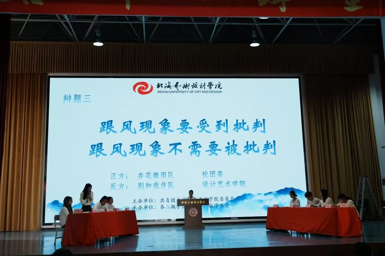 第三场比赛辩题为“跟风现象要受到批判vs跟风现象不需要被批判”,双方辩手针对各自的立场展开了激烈的讨论,对于“跟风”的定义双方都有不同的理解,在紧张而激烈的发言中各自阐释不同观点,语言交锋,思维碰撞,现场展现良好的辩论氛围。