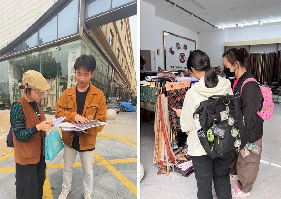 在面料选取与服装品牌调研过程中,同学们切身体会到上千种不同面材料的肌理与变化,领略到中国服装的美及云裳小镇独特的文化底蕴,提高了自己的人文知识素养和审美能力。同学们通过观察、体验、思考、交流等方式搜集了大量信息和资料,启发帮助自己思考当下时装的面料流行趋势及审美趋势。
