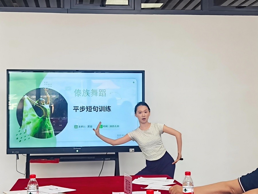 号粟琼老师上了一堂具有傣族舞蹈魅力的教学课,讲解了傣族舞蹈里最具我特色的基本步伐之一《如何使用膝盖带动身体的动律》。粟琼老师示范舞蹈动作、专业讲解动作名称地讲解傣族民族文化的艺术和风土人情,强调了膝盖的屈伸能够带动每个身体的律动重要性以及下半身大腿控制能力。