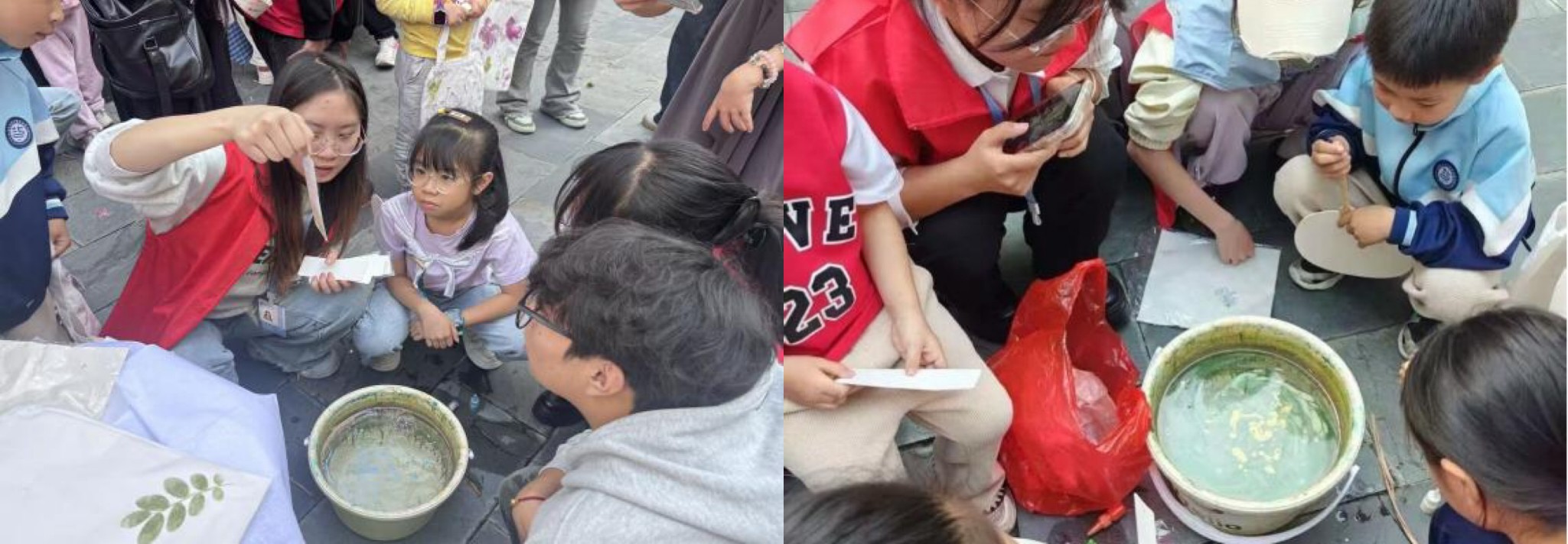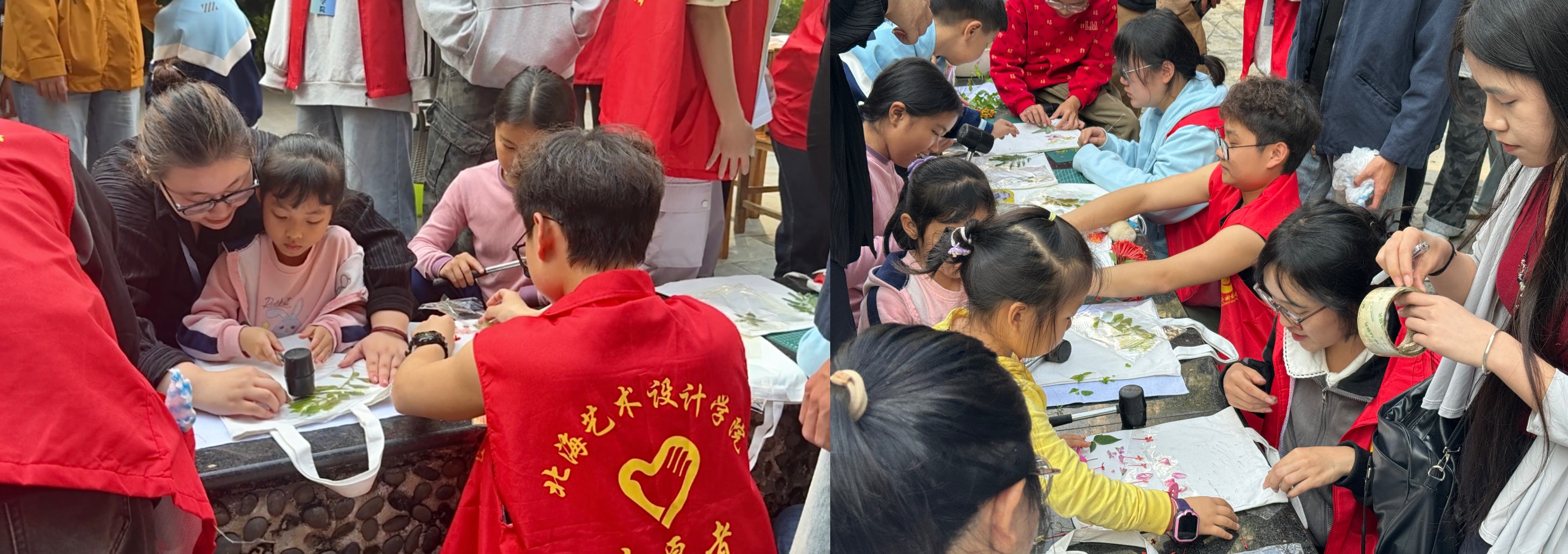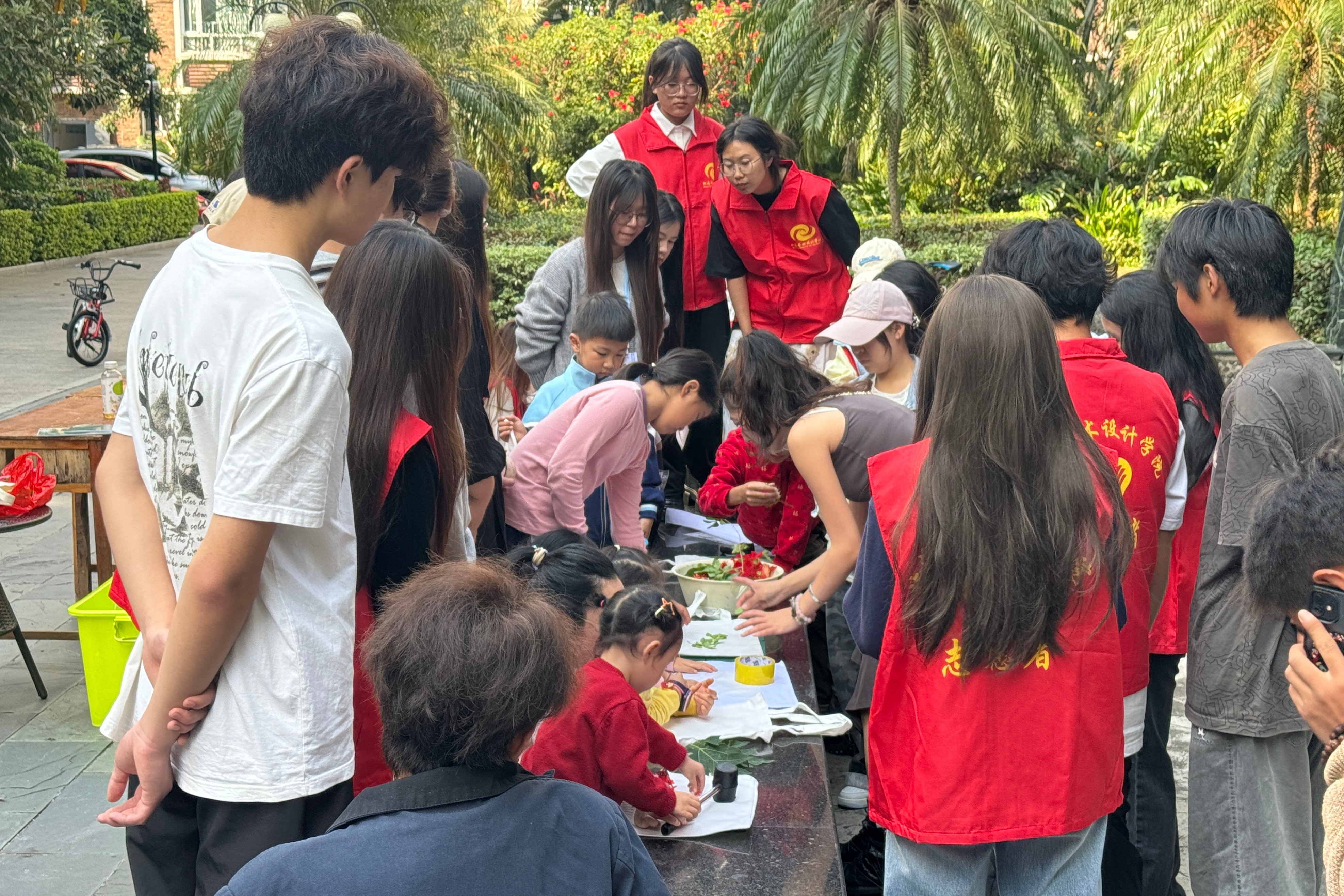 活动现场一共设置植物拓染、漆扇创作两大手工体验区,以一个社区志愿服务组,志愿者们分工明确、热情投入