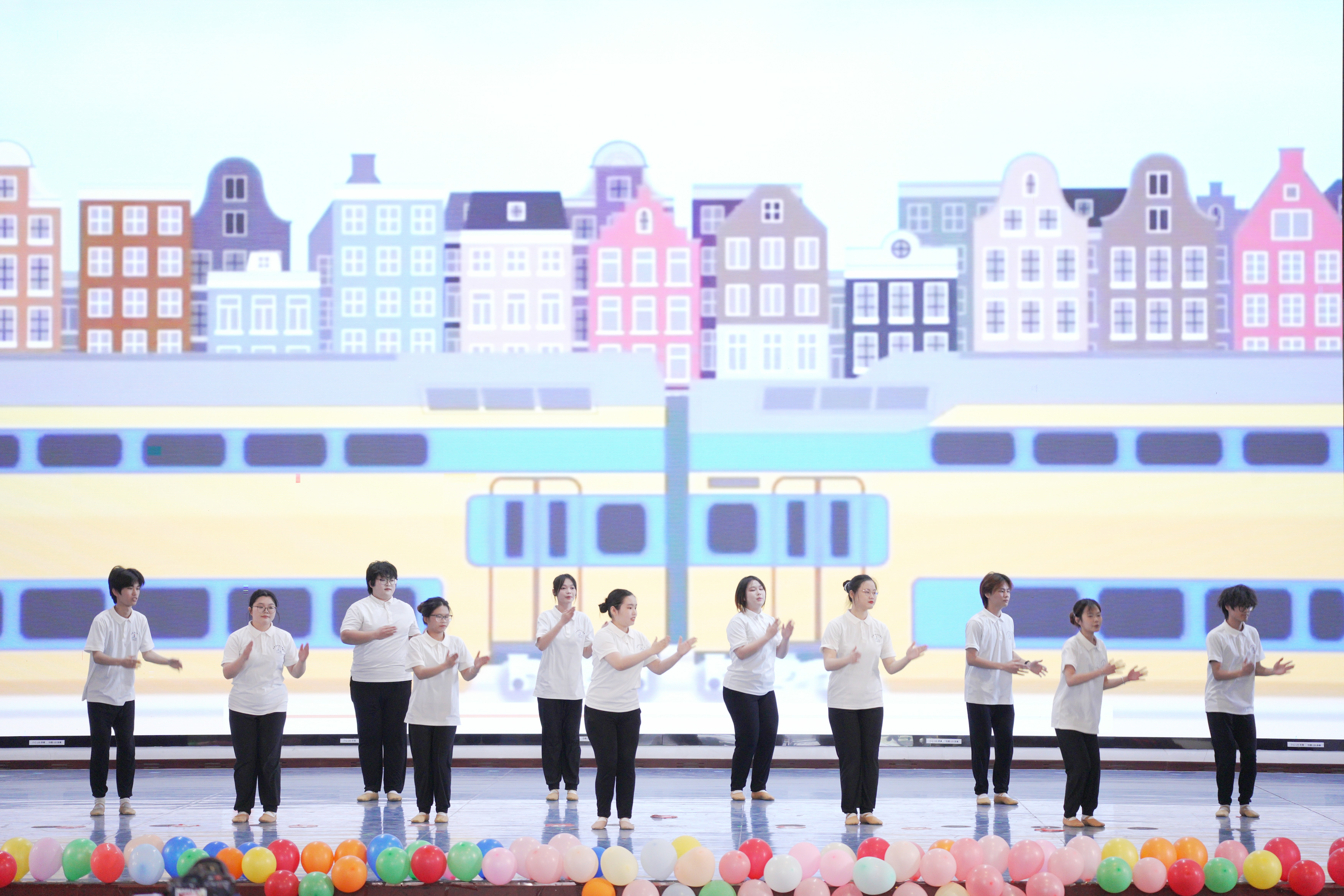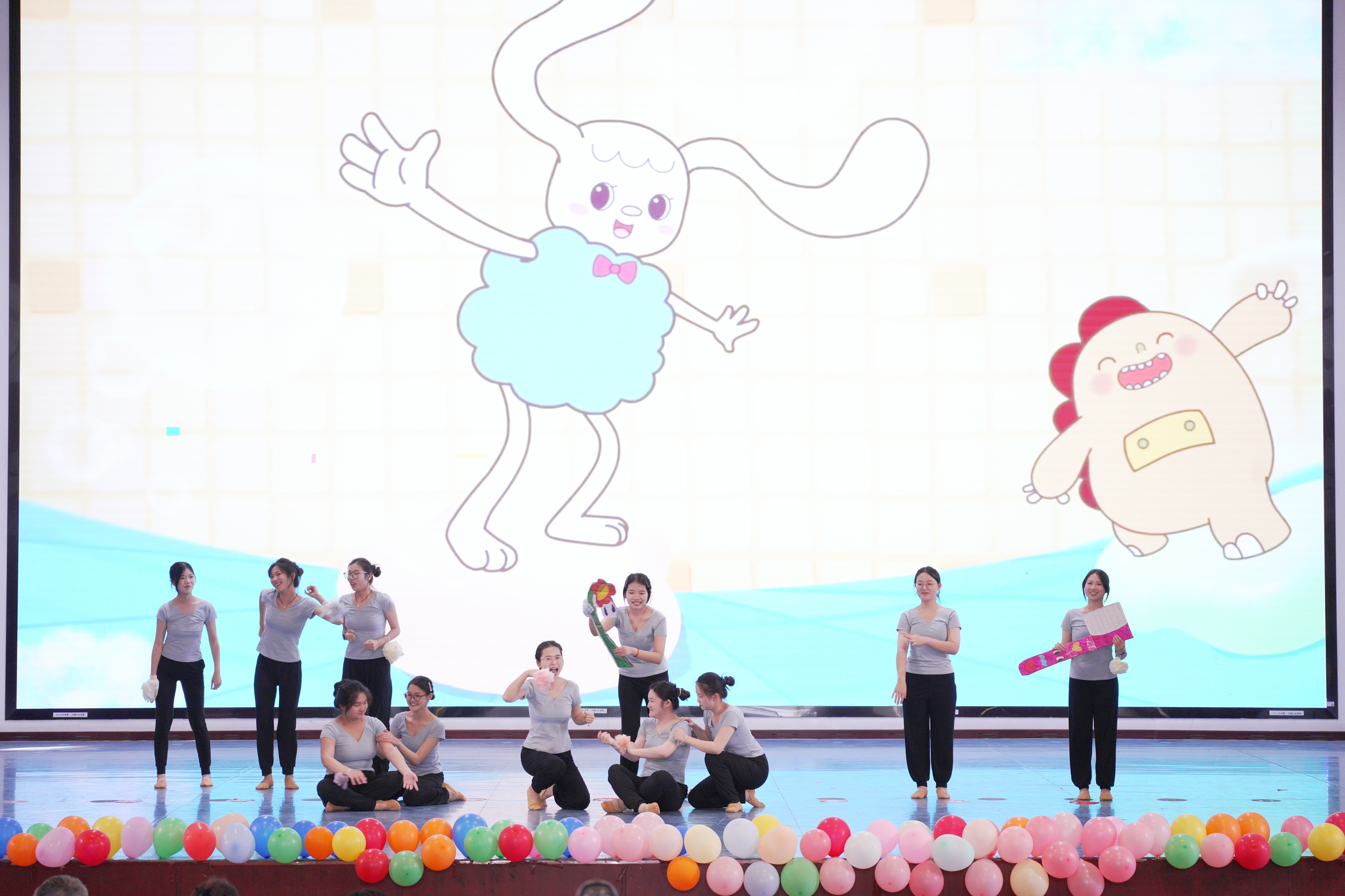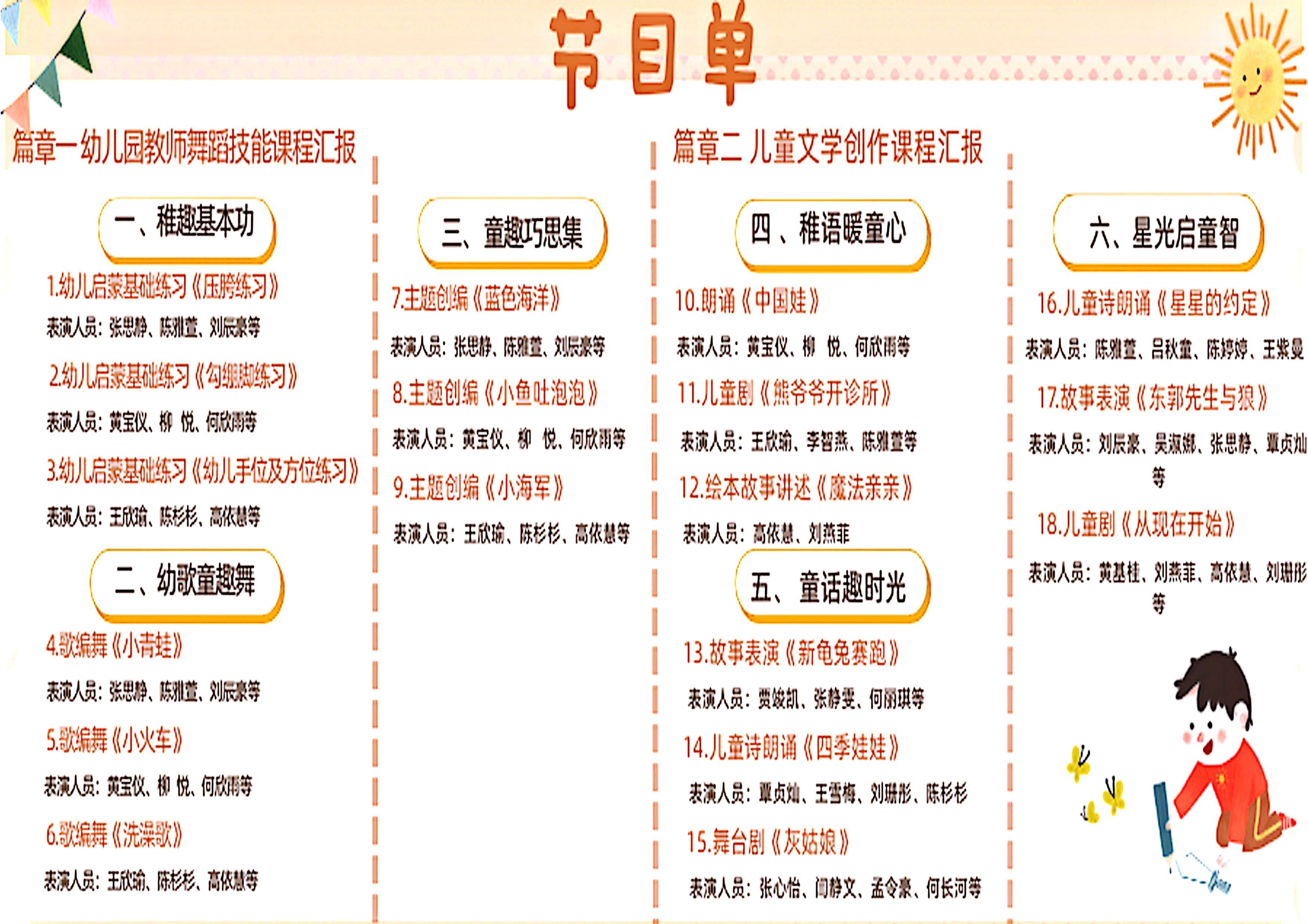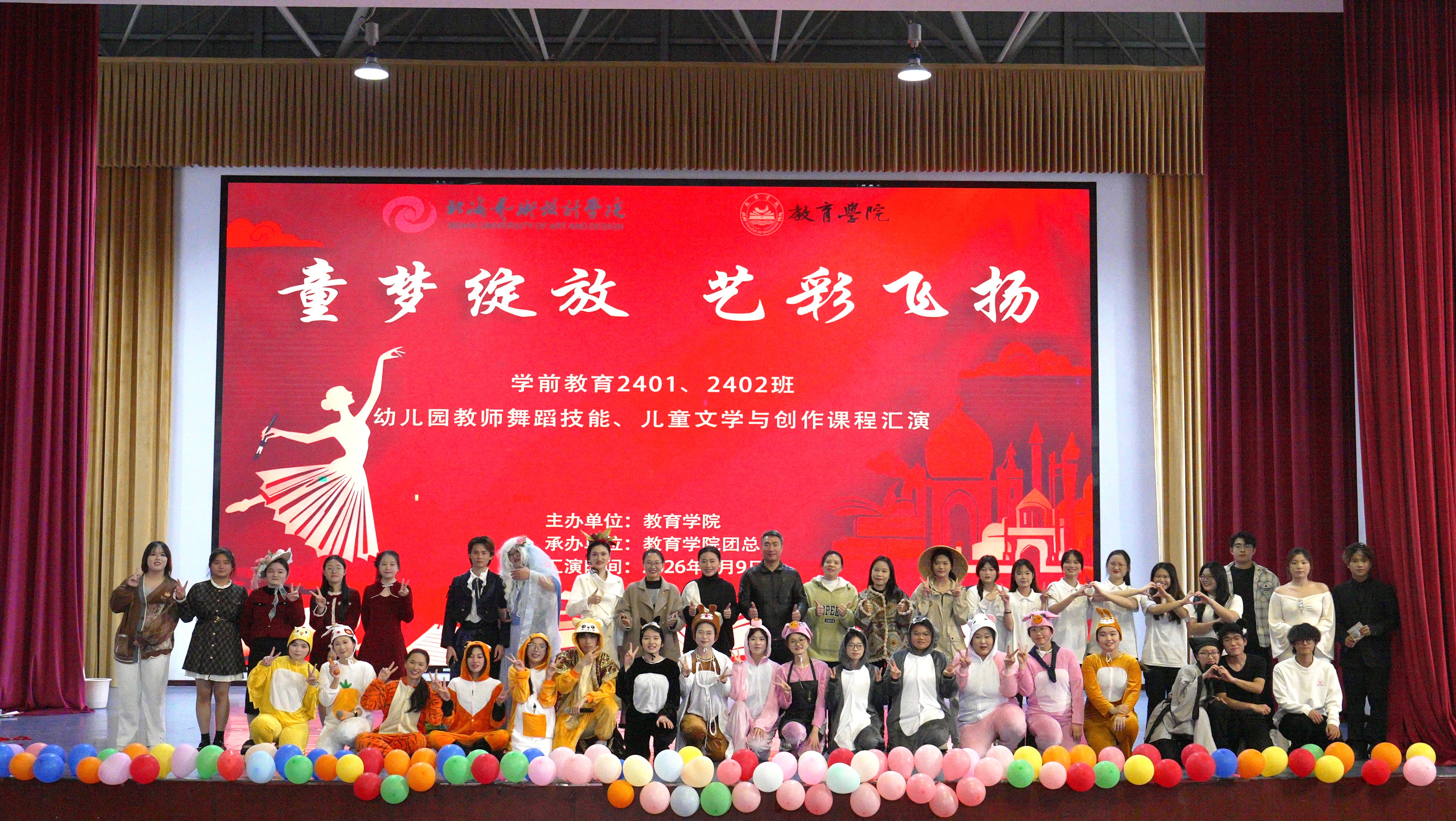 学前教育专业坚持能力导向、以学生发展为中心,通过学训结合的培养模式,将学前教育岗位需求渗透于人才培养全过程,聚焦打造学生突出的艺术创造能力,着力培养其“画、写、说、弹、唱、跳”的综合艺术素养。本次汇报以《幼儿园教师舞蹈技能》《儿童文学与创作》两门课程为依托,坚持理论与实践相结合在邓欢老师、陈美霖老师的指导下,学前教育2024级全体同学综合运用美术、音乐、舞蹈、儿童剧目编排等专业技能,从展演策划、节目编排、现场布置等多个环节全程参与,通力协作完成了本次汇报活动。