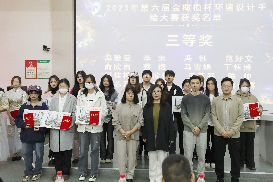 (第六届“金橄榄杯”环境设计手绘大赛颁奖师生合影)