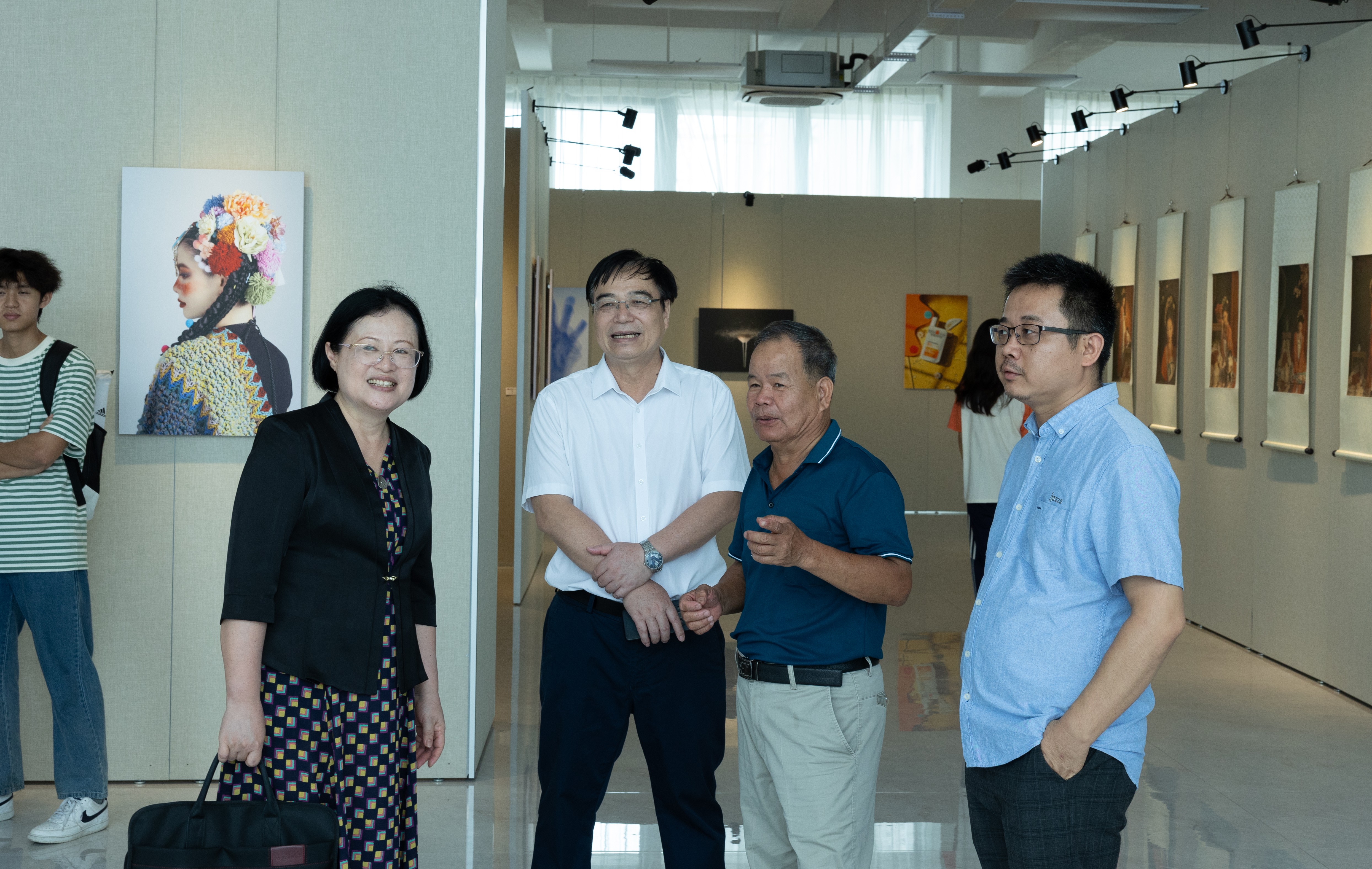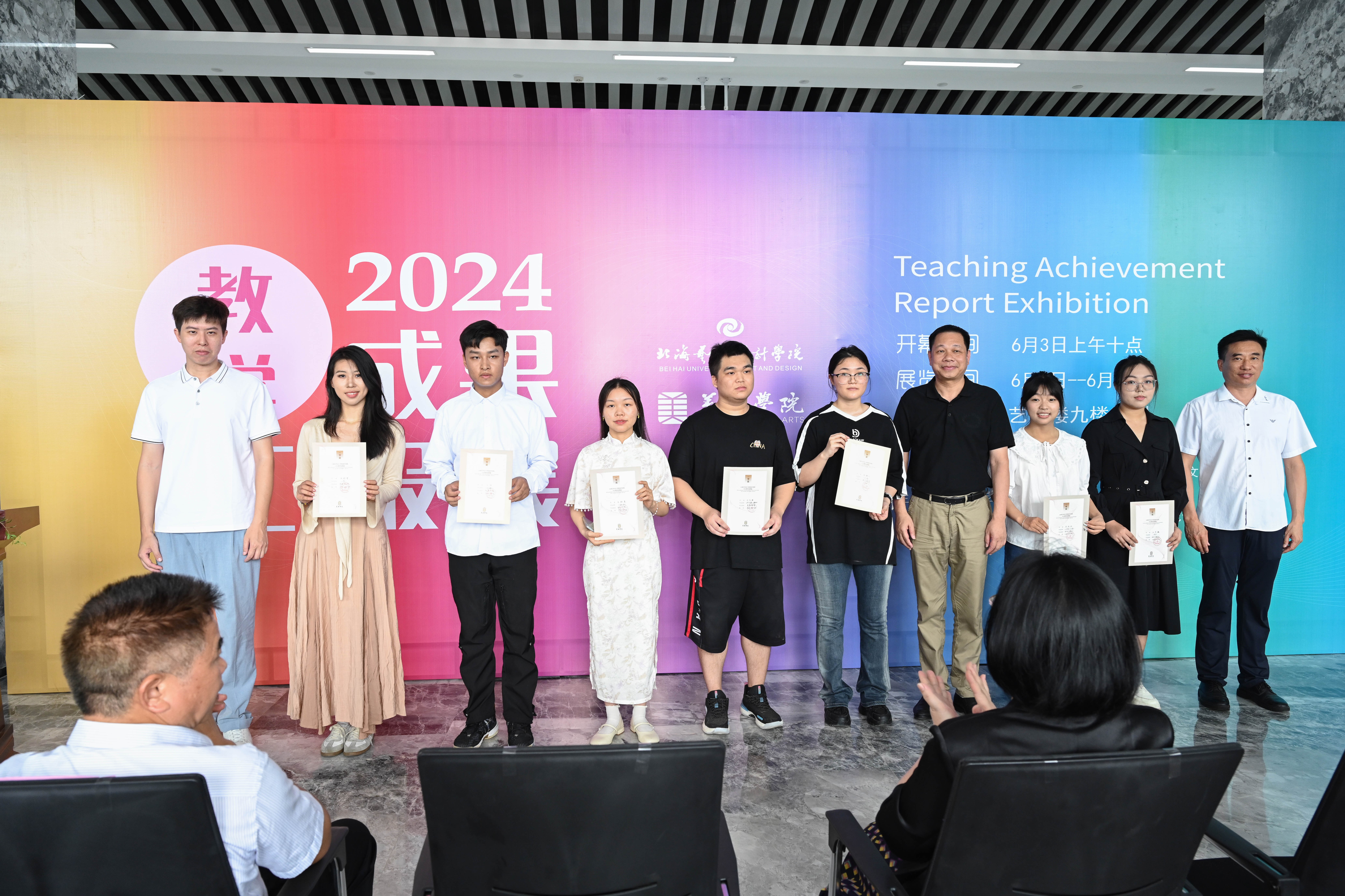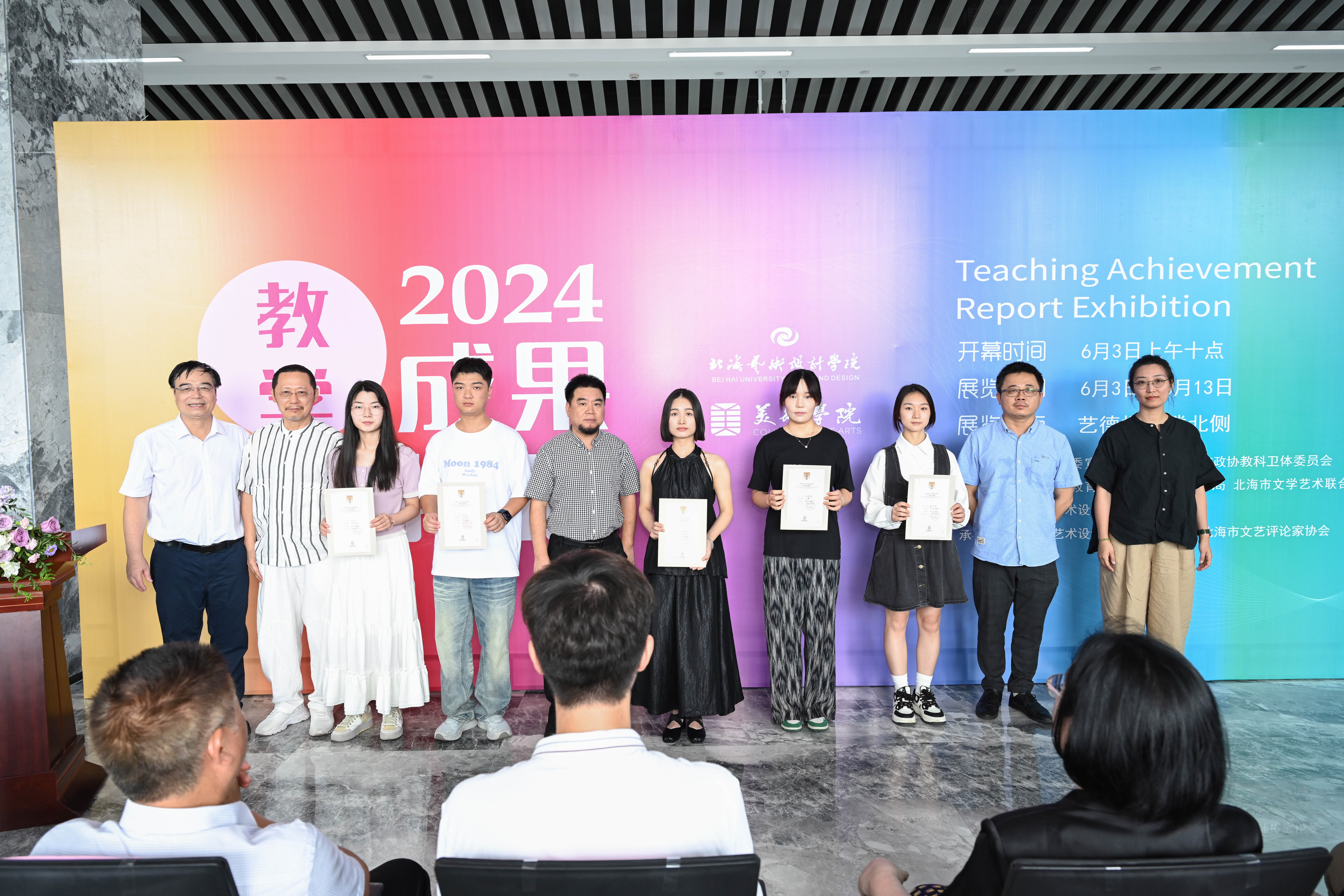 广西大学四级职员、副研究员李高南,中共北海市委宣传部副部长张阳,北海市政协教科卫体委员会主任何文礼,北海市文学艺术界联合会副主席曾作剑,北海市旅游文体局科长钟建华,北海市侨联党组成员、办公室主任杨长星,北海市画院院长、北海市美术家协会主席、美术学院教授蔡群徽,一级美术师、美术学院肖畅恒教授,中国工艺美术大师、美术学院白耀华教授,北海艺术设计学院董事长郑念贻,校党委书记秦宪儒,副校长陶立阳,副校长包建明,美术学院院长刘斌,美术学院执行院长龚为,美术学院副院长金凯婧,美术学院副院长肖玺,美术学院副院长殷声,美术学院何二民教授,美术学院崔君旺教授,美术学院黎东明教授,美术学院唐海教授,美术学院陈建江教授,北海市千朵美术培训学校校长玉坤妮,贝芘摄影负责人庄智俅,以及美术学院各教研室主要负责人及部分师生共300余人参加汇报展开幕式。美术学院副院长肖玺主持开幕式。