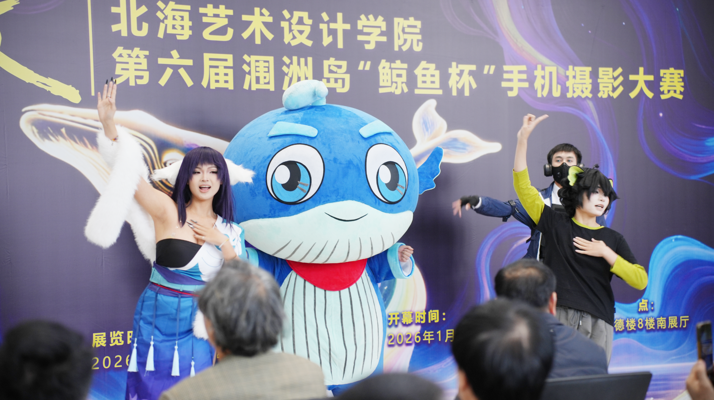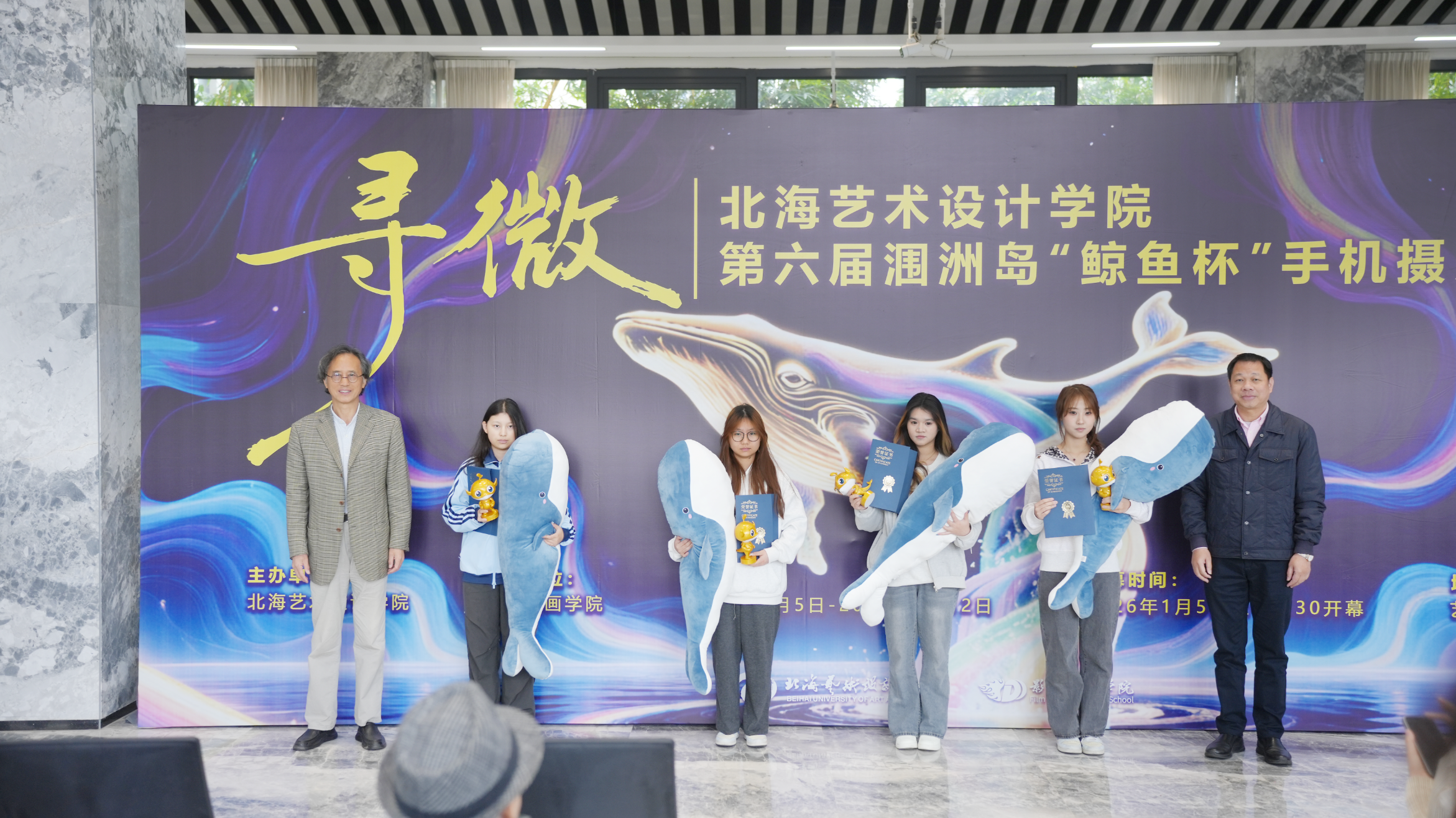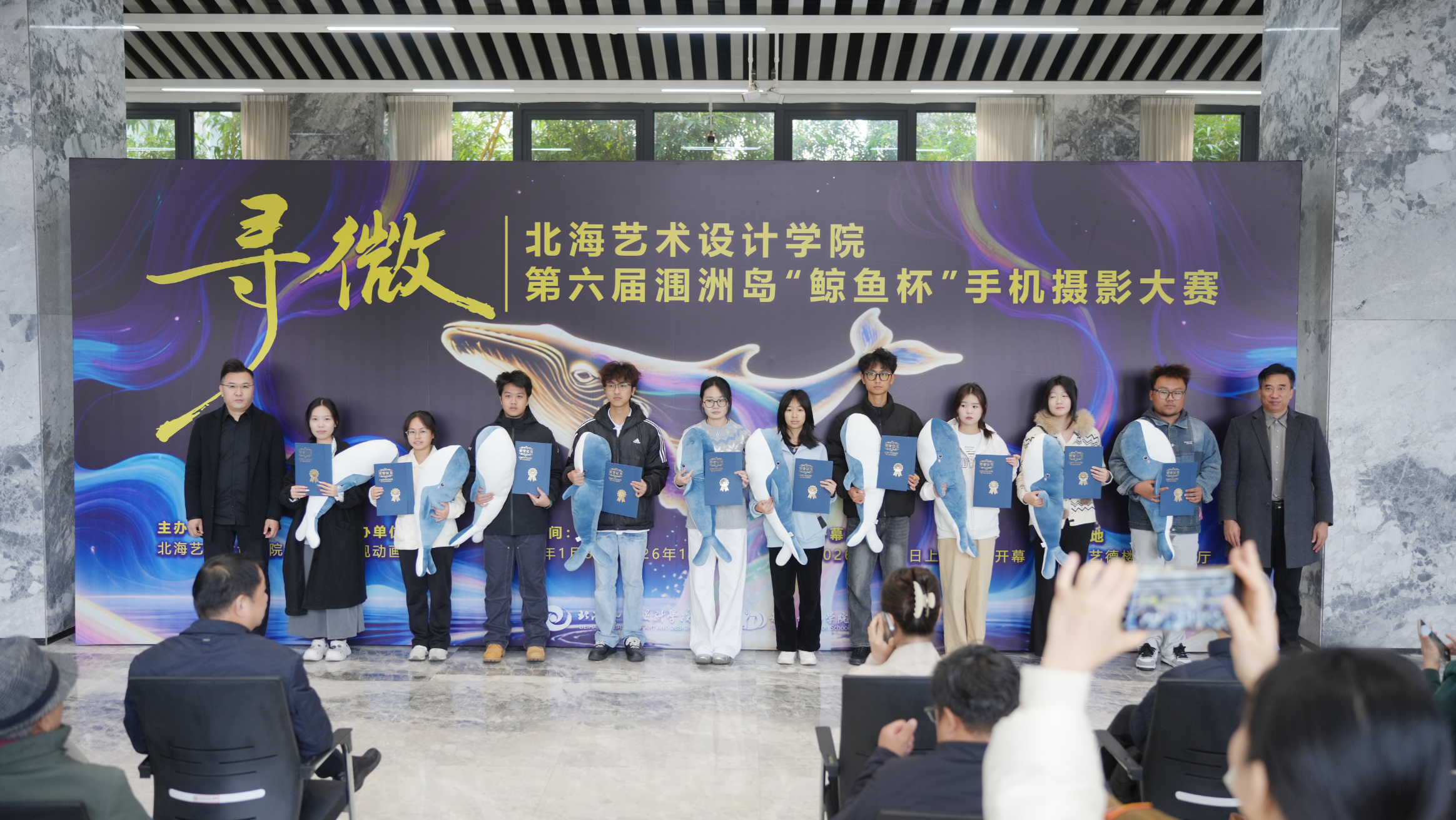 12月25日上午,第六届涠洲岛“鲸鱼杯”手机摄影大赛作品展开幕式暨颁奖仪式在艺德楼1楼举行。本届大赛以“寻微”为主题,由北海艺术设计学院主办、影视动画学院承办。学校党委书记覃宪儒,校长卢新华,副校长陶立阳、邱杰、包建明、何煜等校领导出席活动。活动还邀请了中国传媒大学赵晖教授、广州美术学院陈赞蔚教授、北京联合大学陈世红教授、北京电影学院孙平教授、吉林动画学院葛莹莹教授、青海师范大学袁志祥教授、广西艺术学院陈雷教授、南宁师范大学刘晓东教授,以及北海华彩文化传媒有限公司总经理陈丛越、北海市融媒体中心主持人李超等高校与行业嘉宾莅临指导。学校各二级学院负责人、专业带头人及师生代表共同参与开幕式。活动由影视动画学院院长助理邱红叶主持。