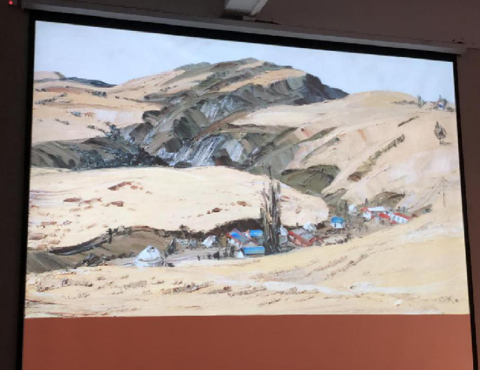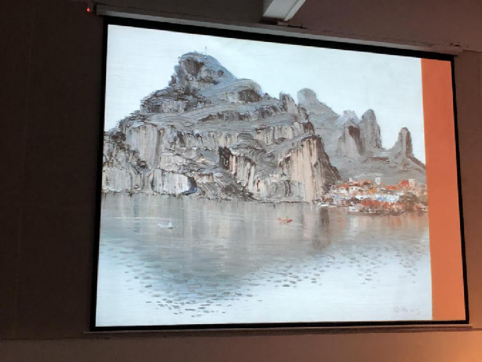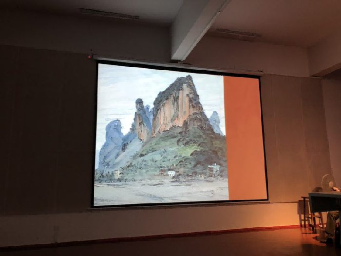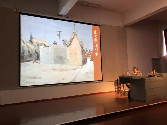 其次,杨诚教授讲述油画风景写生有两点很重要,一是要树立自己的艺术思想观念,二是要注意油画写生的要求。并列举自己的一些作品给大家做了详细的分析,讲述在对于山水写生的时候,要注意山与山之间的联系,要描绘出山的厚重与原始的状态,加强感觉,构图饱满,由远及近,从前往后依次进行;对于民居写生时要注重生活的状态和物品的历史感;写生田园风光时,一般绿色最难描绘,但我们应该是先找出最绿色,然后分清冷暖进行绘画,着重强调了色彩关系的运用。