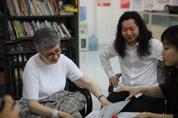 下5.30在综合楼3动画工作室,学院与Jane Stanton院长进行了教学座谈动画学院常务副院长陶立阳Jane Stanton院长介绍了学校历届学生的优秀作品,随后Jane Stanton院长对学院的作品表示了高度赞赏,随后在四楼演播厅参观和观看了学院历年的作品影片,看完后Jane Stanton院长表示了由衷的赞叹,她表示动画学院的作品非常优秀,不论是手绘还是二维,三维都做得很棒,在场的院领导们也表达了要互相学习的态度。