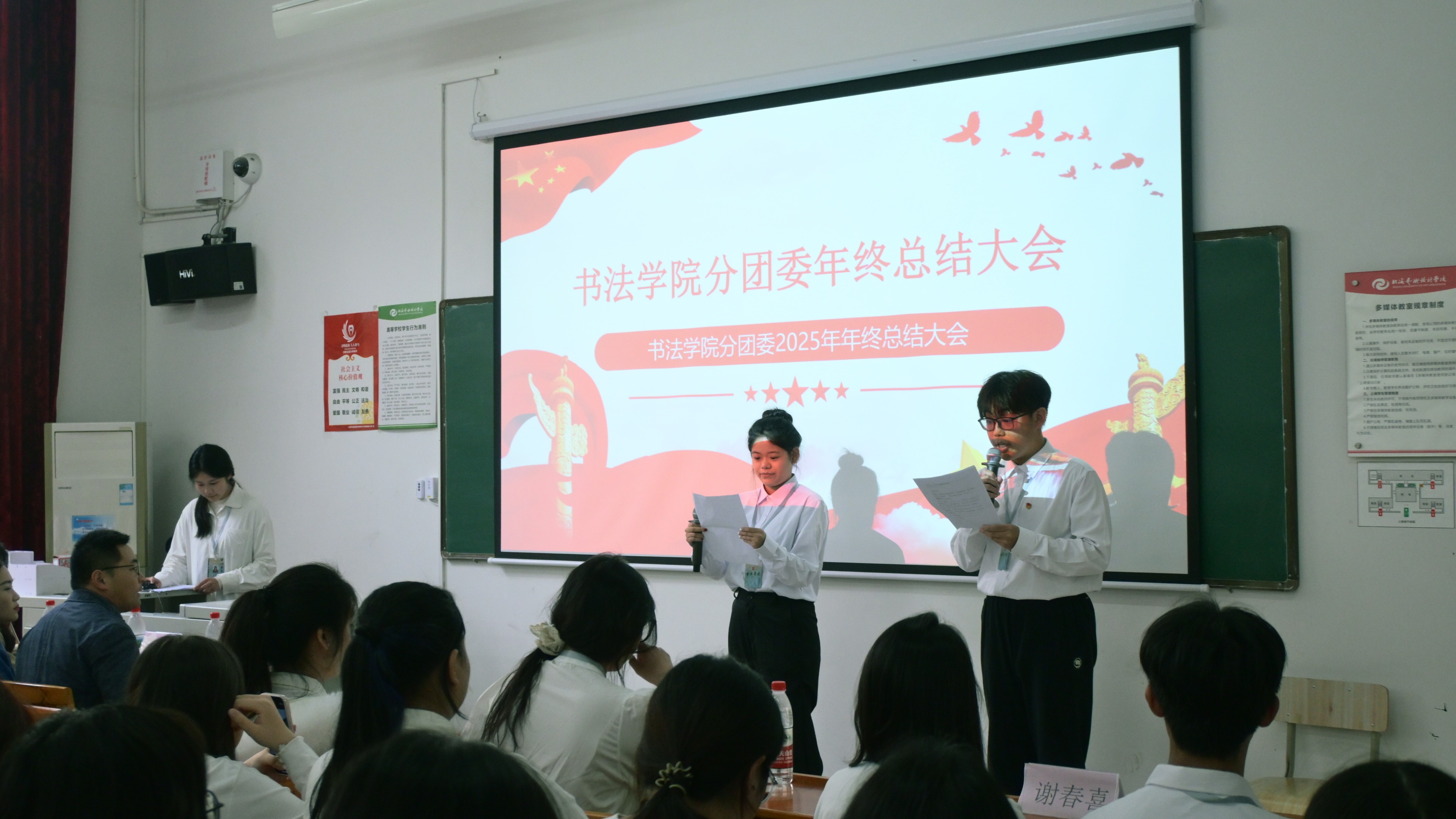 2026年1月16日,书法学院分团委在西区功德楼105教室召开2025年度年终总结大会。会议回顾过去一年工作成果与不足,明确未来发展方向,为2026年工作开展奠定基础。书法学院党支部副书记左云飞、副院长李家琪,分团委指导教师石建玲、柳涵懿以及各部门学生负责人参加会议。