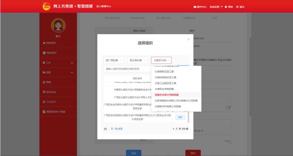 申请转入组织:选择“团广西区委”>“团北海市委”>“北海艺术设计学院团委”,搜索班号,选择所属班级团支部。