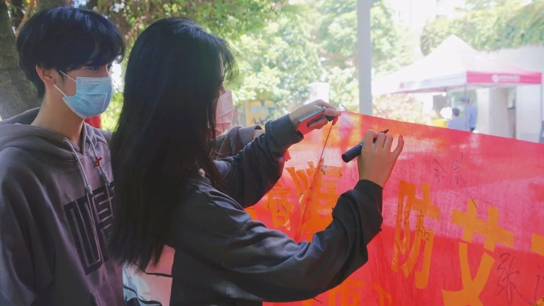 在青志协志愿者的号召下,同学们积极响应,纷纷在横幅上写下自己的名字,以这种特殊且新颖的方式让同学们一起参与到防艾活动中来。