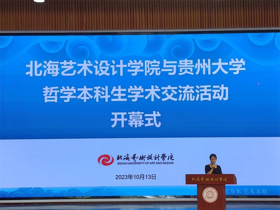 近日,北海艺术设计学院与贵州大学哲学本科生学术交流活动开幕式在我校西校区大礼堂顺利举行。此次开幕式由北海艺术设计学院主办, 贵州大学哲学学院党委书记周乐成、哲学学院宋君修博士、哲学学院梅其君副院长以及学生代表受邀出席。我校总督学王斌,人文教育学院名誉院长、哲学专业带头人蒙绍荣教授,人文教育学院院长熊秀峰参加此次活动,开幕式由李水亮副院长主持。