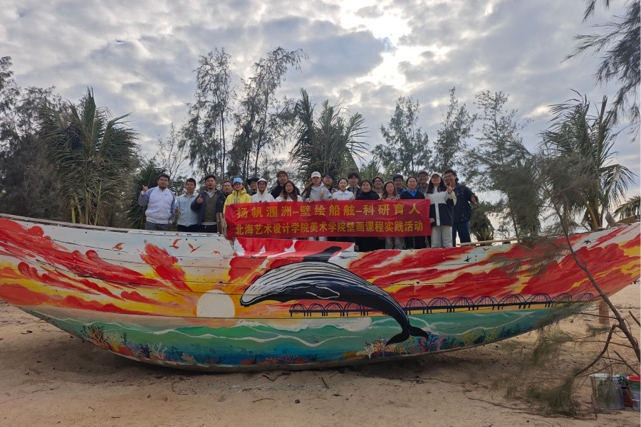 接到委托后,美术学院迅速响应,第一时间组织召开师生动员会,统筹部署相关工作。为确保彩绘质量与效率,活动由美术学院综合办副主任景思晔、实验室主任袁志伟,实验室副主任孙海洋、教师程宣睿带队,从壁画专业选修课中严格遴选17名专业能力突出学生组成创作团队,于11月15日清晨集中登陆涠洲岛,正式启动渔船壁画创作任务。