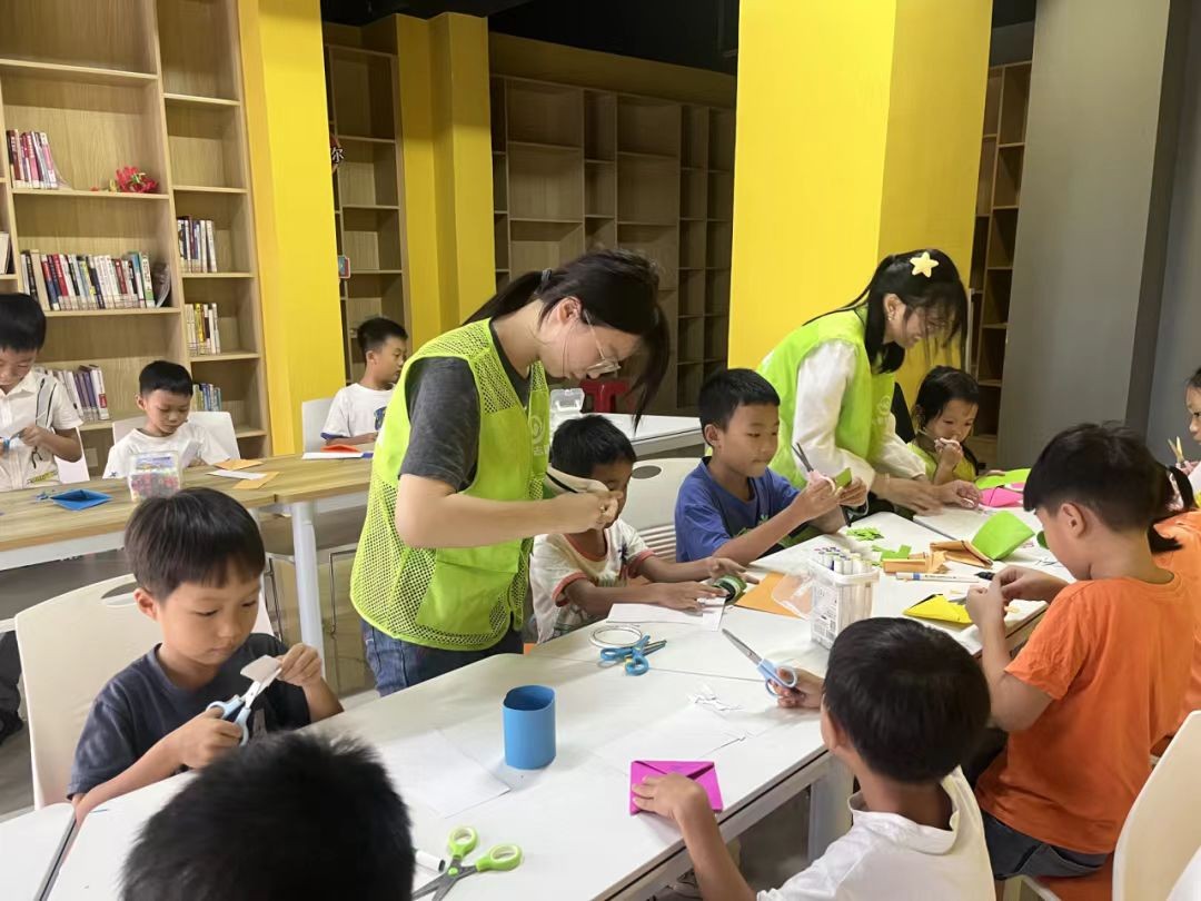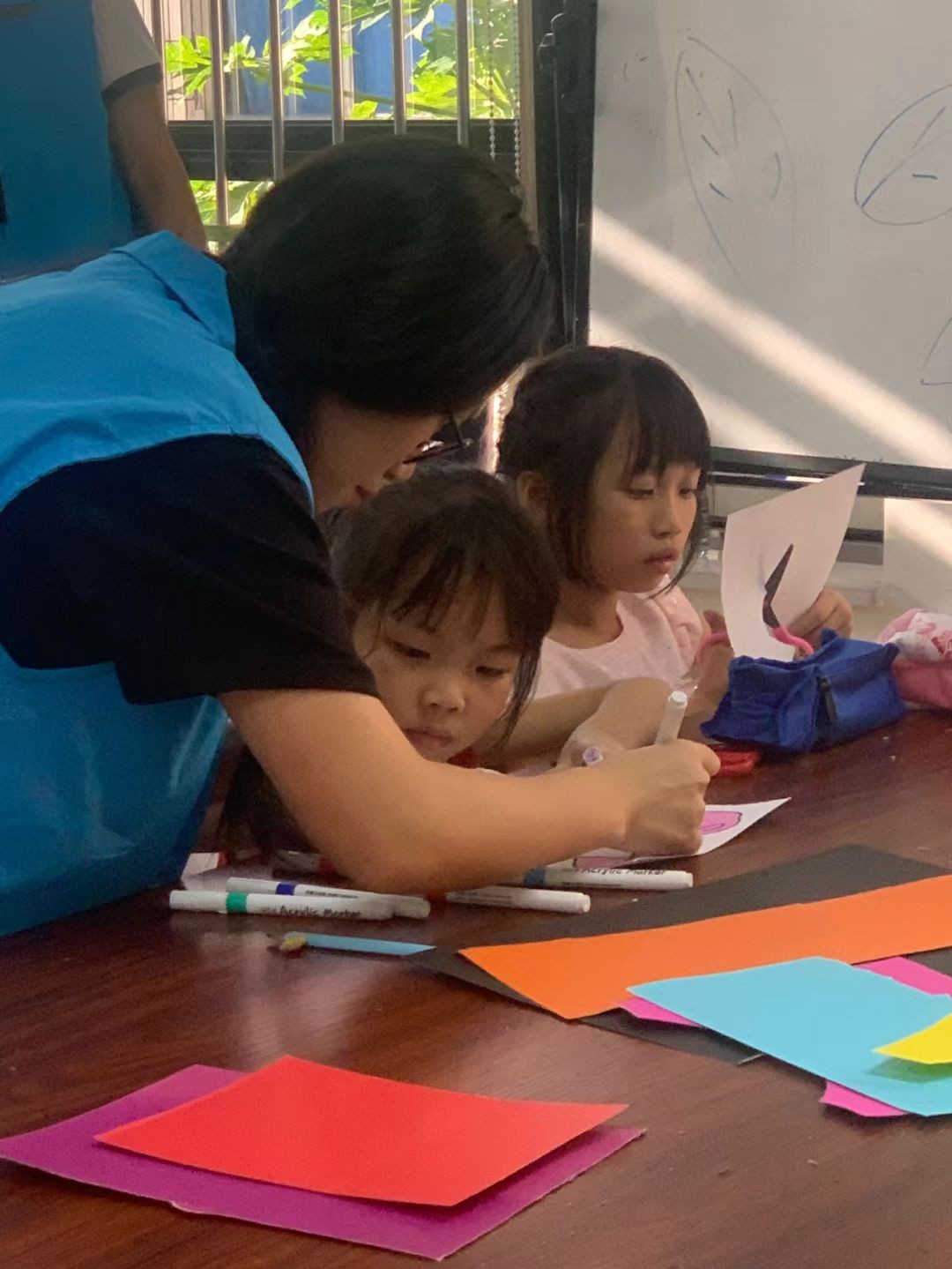 我们首先来到的是北部湾社区,正巧碰见孩子们手拿剪刀在纸上裁出他们心中的“最佳朋友”。在志愿者的指导下,两只乖巧的小兔子被小朋友们展现得栩栩如生。他们将小兔子画出形状,涂上色彩,剪出形状,虽然老师在白板上提供了模板,但小朋友们总有天马行空的想象。志愿者们也发现,每个小朋友的小兔子都不一样,那是他们独一无二的朋友。