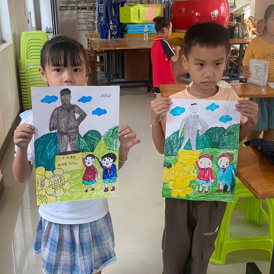 最后我们来到了孙东村,这里正在举行“缅怀中山先生,弘扬爱国精神”活动。伟大的孙中山先生,是革命的先行者,他身上的爱国精神值得我们学习传承。老师为小朋友们介绍讲述了孙中山先生的事迹,讲述完毕,小朋友们都被孙中山先生的事迹深深震撼,立志要向孙中山先生学习。在老师的引导演示下,小朋友们纷纷画出了孙中山先生的雕像画。在画中我们可以清楚地看到,孙中山先生的画像下站着两位少先队员,他们代表着中国少先队员们对孙中山先生真挚的敬意。
